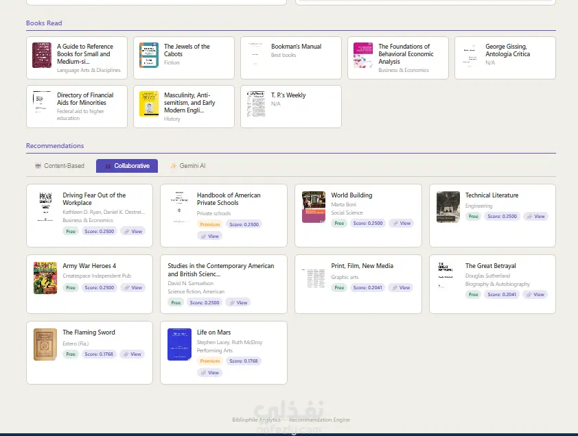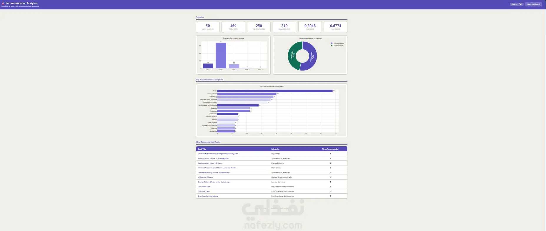 منصة متكاملة لتحليل بيانات المستخدمين والكتب مع نظام توصيات ذكي باستخدام تقنيات Machine Learning وAI.