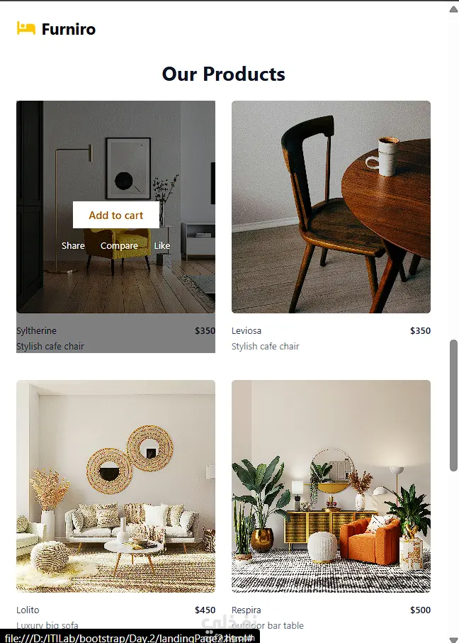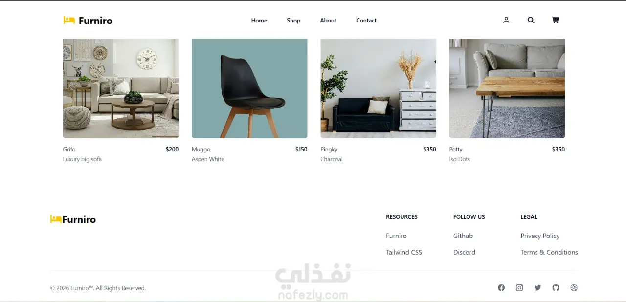 تصميم وتطوير صفحة هبوط احترافية لموقع أثاث (Furniro)، تهدف إلى عرض المنتجات بشكل جذاب وتحسين تجربة المستخدم. تتكون الصفحة من خمس أقسام منظمة لعرض المحتوى بشكل واضح وسلس، مع إضافة تأثيرات حركية (Animations) لزيادة التفاعل وإضفاء طابع عصري على التصميم. تم تنفيذ المشروع باستخدام HTML وCSS وTailwind وJavaScript، مع مراعاة أن يكون التصميم متجاوب ويعمل بكفاءة على مختلف الأجهزة.