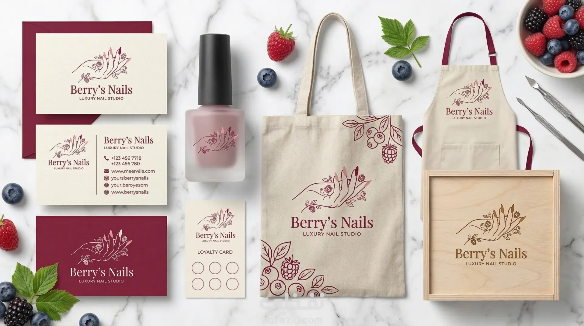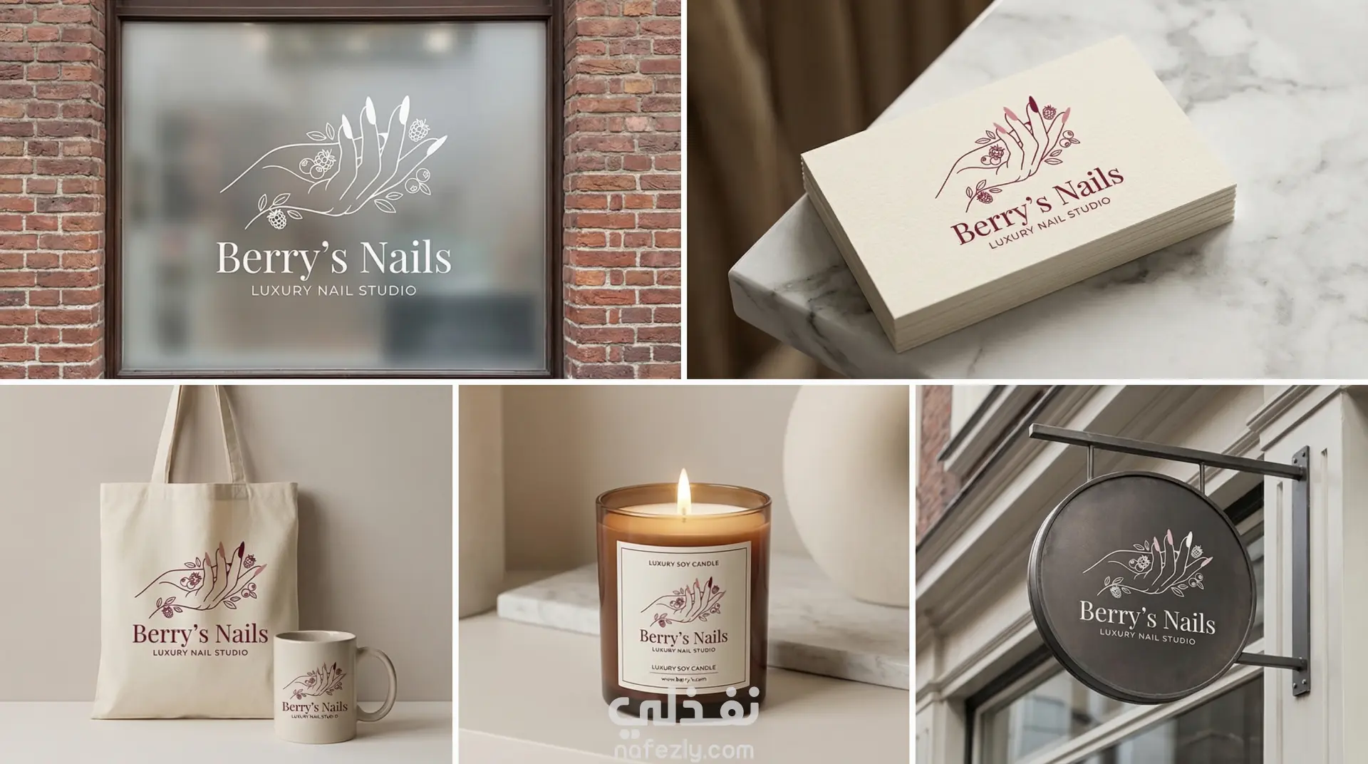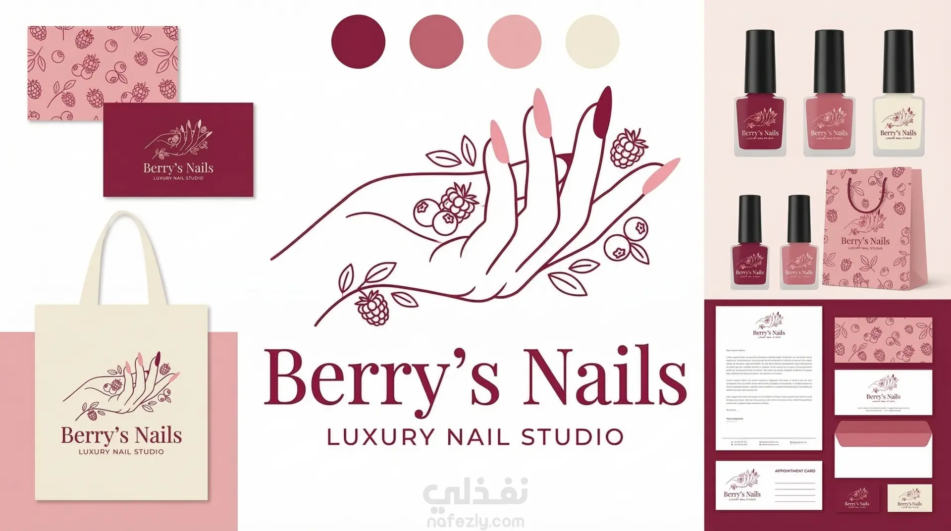 تصميم هوية بصرية كاملة لبراند Berry’s Nails مستوحاة من الألوان الناعمة والـ berry، لتعكس الأناقة والاهتمام بالتفاصيل في مجال العناية بالأظافر.