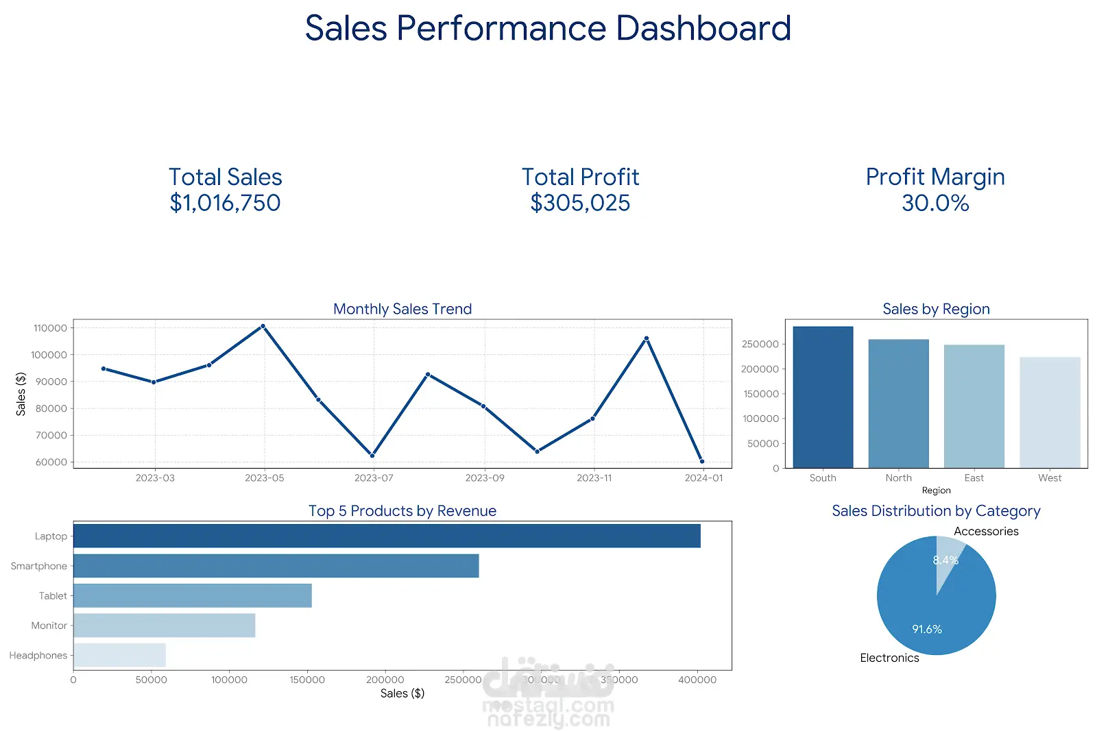في هذا المشروع، قمت ببناء حل تقني متكامل لتحويل بيانات المبيعات الخام إلى تقارير دقيقة تدعم اتخاذ القرار. لم يقتصر العمل على تصميم الرسوم البيانية، بل ارتكز بشكل أساسي على هندسة البيانات وبناء بنية تحتية قوية تضمن دقة الأرقام وسرعة الأداء.