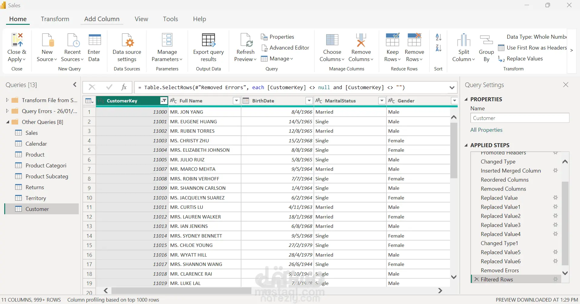 أولاً: تنظيف ومعالجة البيانات (المرحلة الأهم): استخدمت محرر Power Query للقيام بعمليات معالجة متقدمة لضمان جودة البيانات قبل بدء أي تحليل: