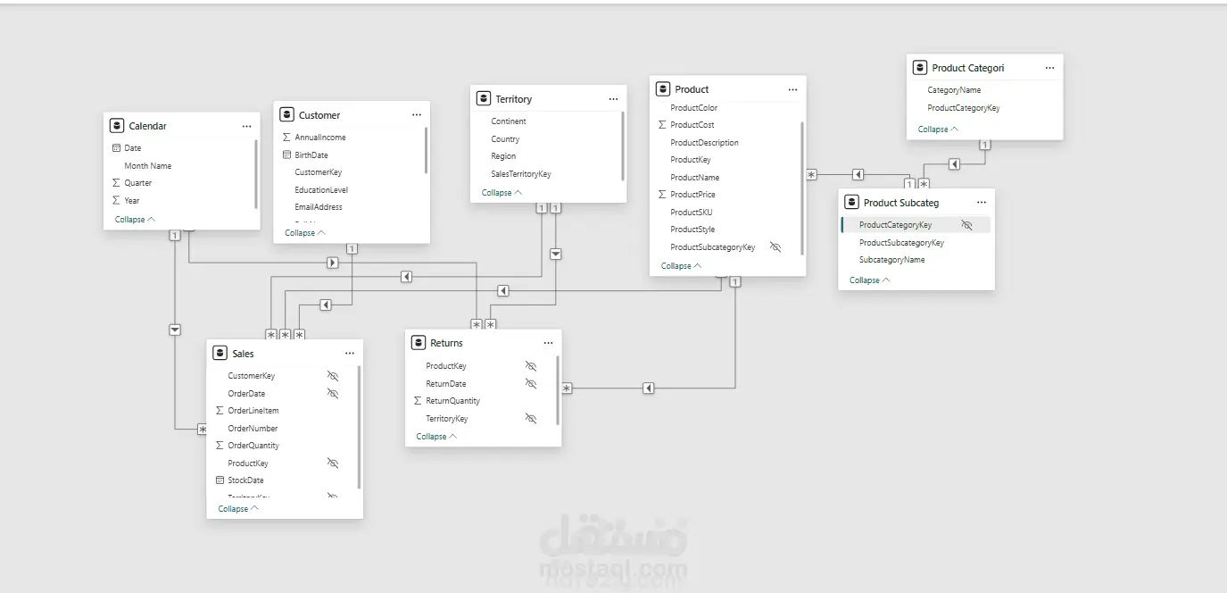ربط الجداول: أنشأت علاقات دقيقة بين جدول المبيعات الرئيسي وجداول المعلومات الفرعية (المنتجات، العملاء، المناطق) لضمان عدم تكرار البيانات.
