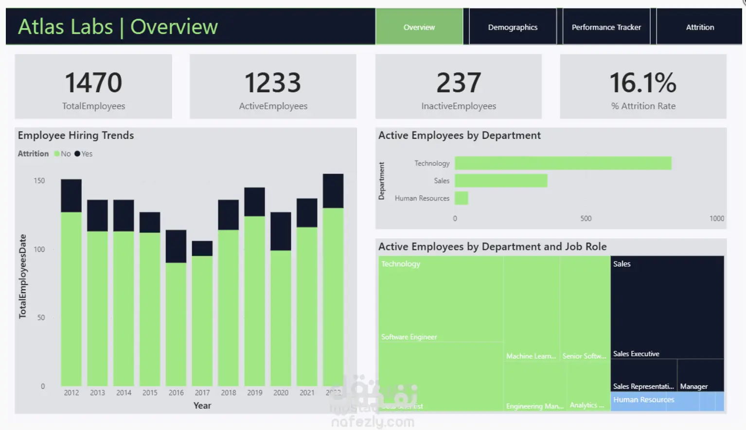 An interactive dashboard designed to provide key insights into employee metrics at Atlas Labs. It includes: - Total, active, and inactive employee counts - Annual hiring trends from 2012 to 2022, segmented by attrition status - Department-wise distribution of active employees - Treemap visualization of job roles across departments This dashboard helps HR and management teams monitor workforce composition, identify retention patterns, and make data-driven decisions. Tools used: Power BI