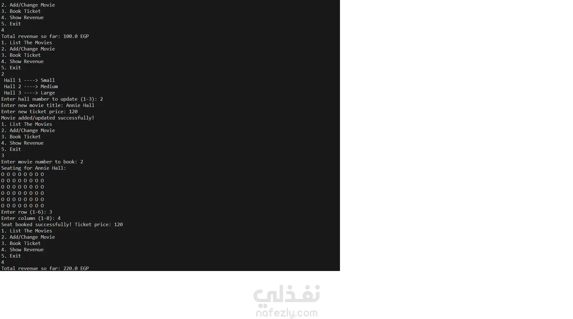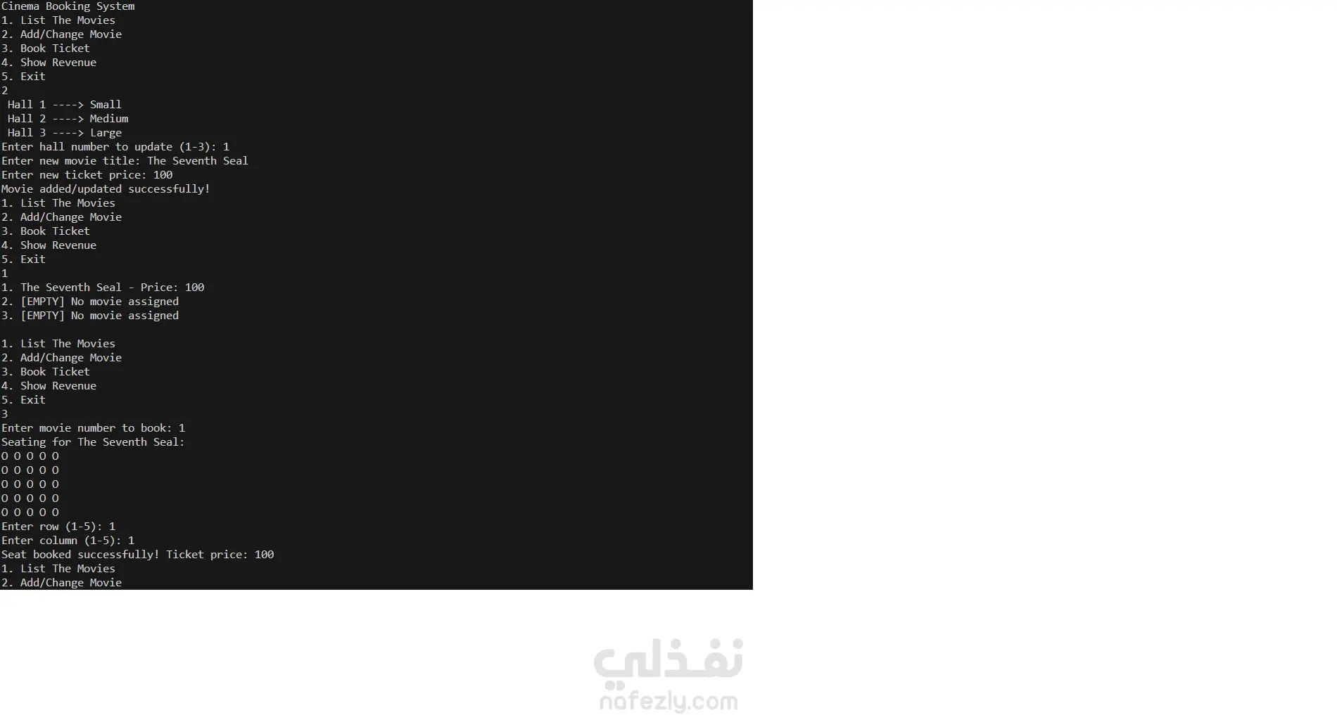 برنامج مكتوب بلغة Java يهدف إلى إدارة عملية حجز تذاكر السينما بطريقة بسيطة ومنظمة. يتيح النظام للمستخدم عرض الأفلام المتاحة في قاعات السينما المختلفة، مشاهدة مخطط المقاعد لكل فيلم، وحجز المقاعد المتاحة بسهولة. كما يوفر النظام إمكانية إضافة أو تغيير الأفلام في القاعات المختلفة مع تحديد سعر التذكرة لكل فيلم، بالإضافة إلى تتبع إجمالي الإيرادات الناتجة عن عمليات الحجز. يعتمد البرنامج على بنية واضحة باستخدام البرمجة الكائنية (OOP)، حيث يتم تمثيل كل فيلم وقاعة عرض مع نظام مقاعد خاص بها، مما يسمح بإدارة عملية الحجز بشكل عملي وسهل الاستخدام.