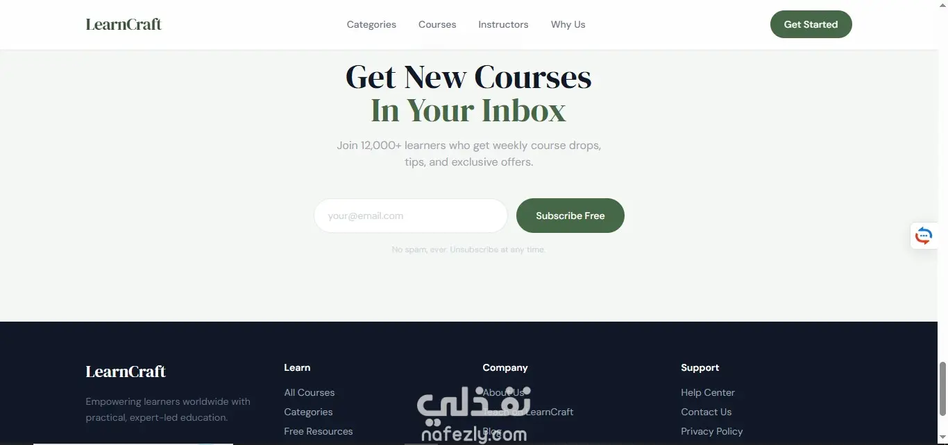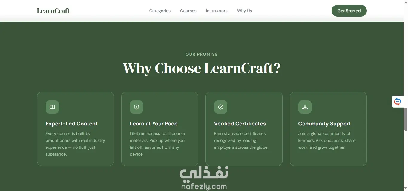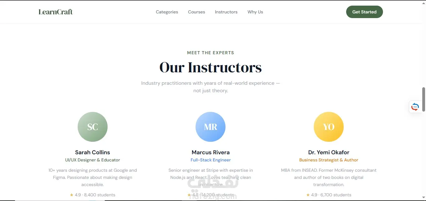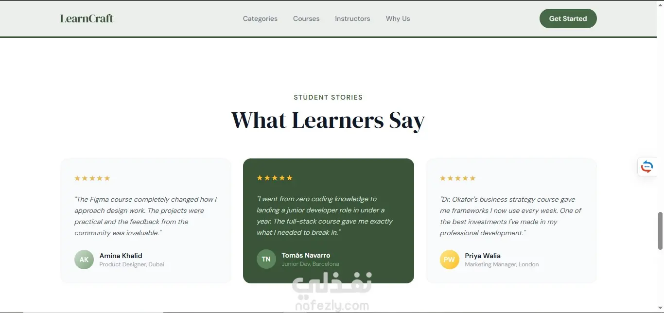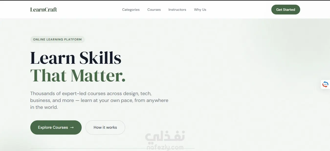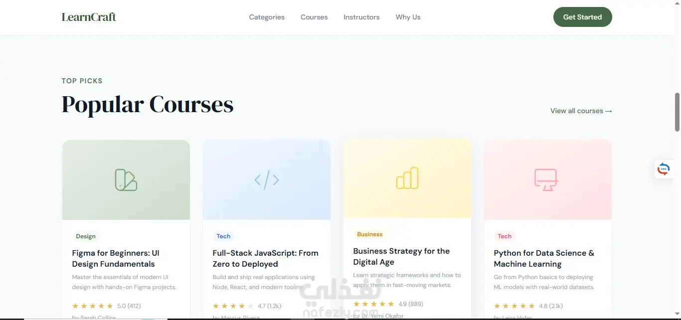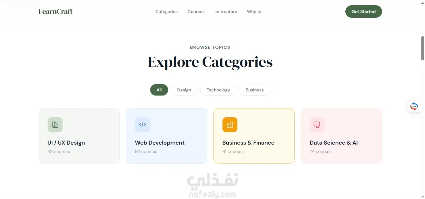 صفحة هبوط لمنصة تعليمية تعرض الكورسات والتصنيفات المختلفة، تم تنفيذها باستخدام HTML5 وTailwind CSS مع تصميم بسيط ومنظم. تم استخدام JavaScript (ES6) لإضافة تفاعل بسيط مثل الفلترة بين التصنيفات والتمرير السلس. المشروع Static بالكامل