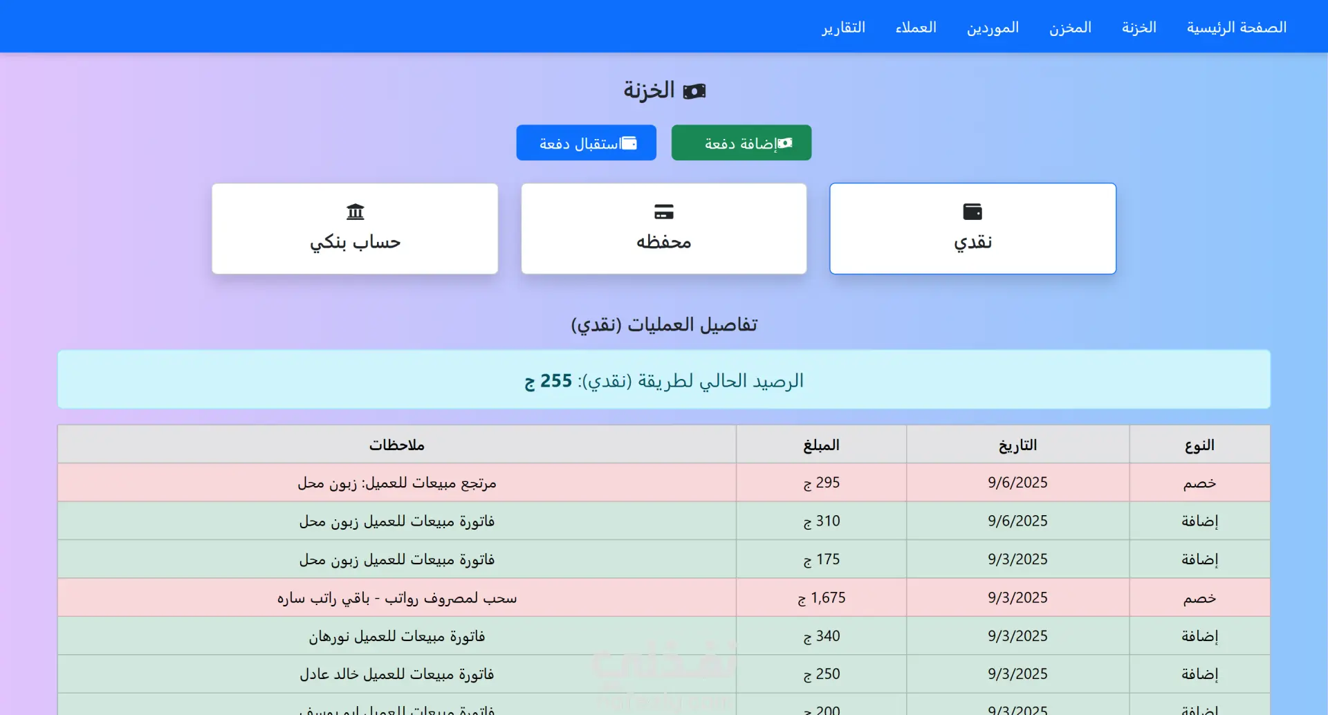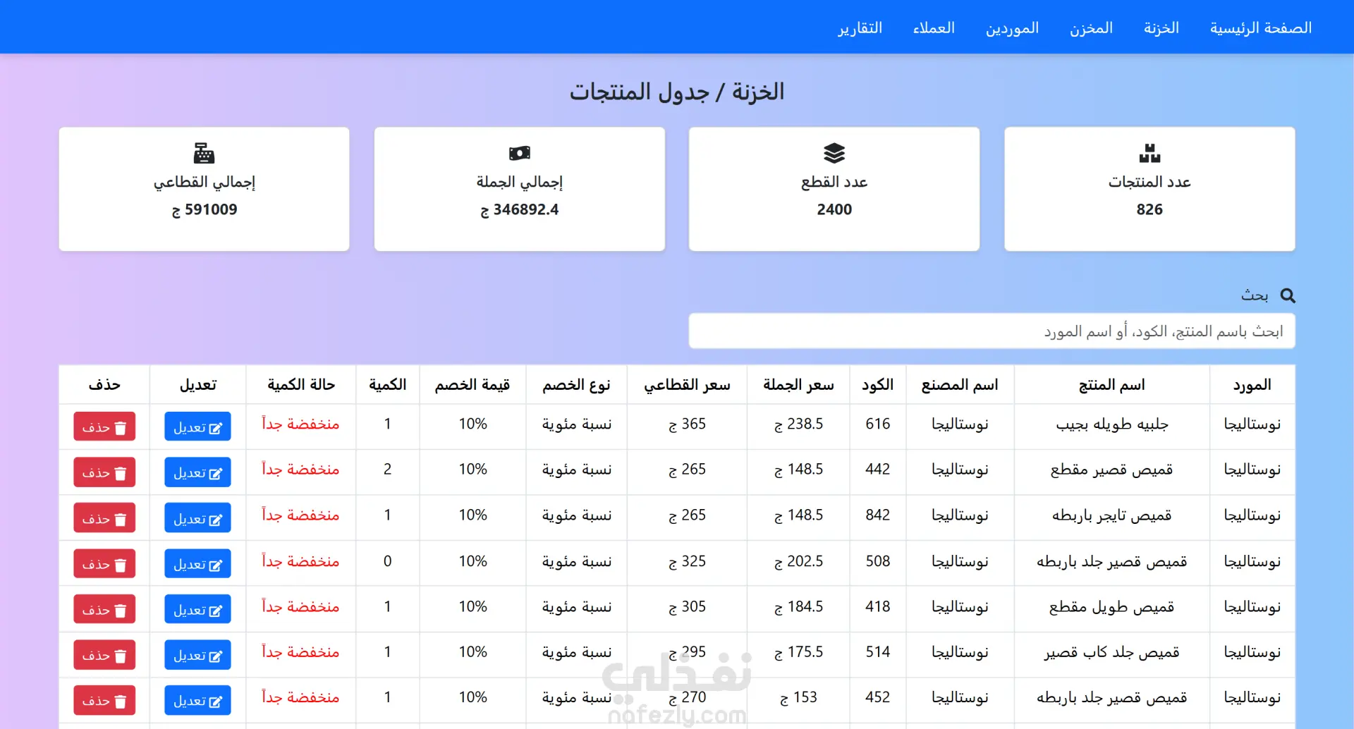 سيستم كامل مخصوص لمحلات الملابس يساعدك تدير المحل بتاعك بكل تفاصيله، من أول إضافة المنتجات ومتابعة المخزون، لحد الفواتير والموردين والعملاء والخزنة والتقارير الشهرية. السيستم معمول بشكل بسيط وسهل الاستخدام عشان أي حد يقدر يتعامل معاه من غير تعقيد. الهدف إنه يوفرلك كل حاجة في مكان واحد: تتابع منتجاتك وأسعارها وكمياتها. تسجل المشتريات والمبيعات والمرتجعات. تتحكم في الموردين والعملاء وكشوف الحسابات. تسجل مصروفاتك وإيراداتك. تدير الخزنة بأنواعها (نقدي – محفظة – بنك). تطلع تقارير مالية وعامة شهرية تعرفك وضع المحل وأرباحك وخسارتك. المميزات الرئيسية: إضافة منتج مع تحديد سعر الجملة والقطاعي والكمية. المخزن فيه كل المنتجات وتنبيه لو الكمية أقل من 5. فاتورة مشتريات فيها بيانات المورد وطريقة الدفع (أجل أو نقدي). صفحة الموردين مع كشف حساب كامل لكل مورد. مرتجع مشتريات. فاتورة مبيعات من المخزن للعملاء مع اختيار طريقة الدفع (أجل أو نقدي). صفحة العملاء فيها كل الفواتير والمرتجعات الخاصة بيهم. مرتجع مبيعات. صفحة المصروفات عشان تسجل أي سحب فلوس من الخزنة. صفحة الإيرادات عشان تضيف أي دخل جديد للخزنة. الخزنة فيها 3 أنواع (نقدي – محفظة – حساب بنكي) وكمان ممكن تضيف دفعة لمورد أو تستقبل دفعة من عميل. تقارير مالية بتعرض إجمالي المشتريات والمبيعات والمصروفات والربح وصافي الربح والعمولة، ودي بتتغير كل شهر. تقارير عامة شهرية بتعرضلك صورة كاملة عن المحل.