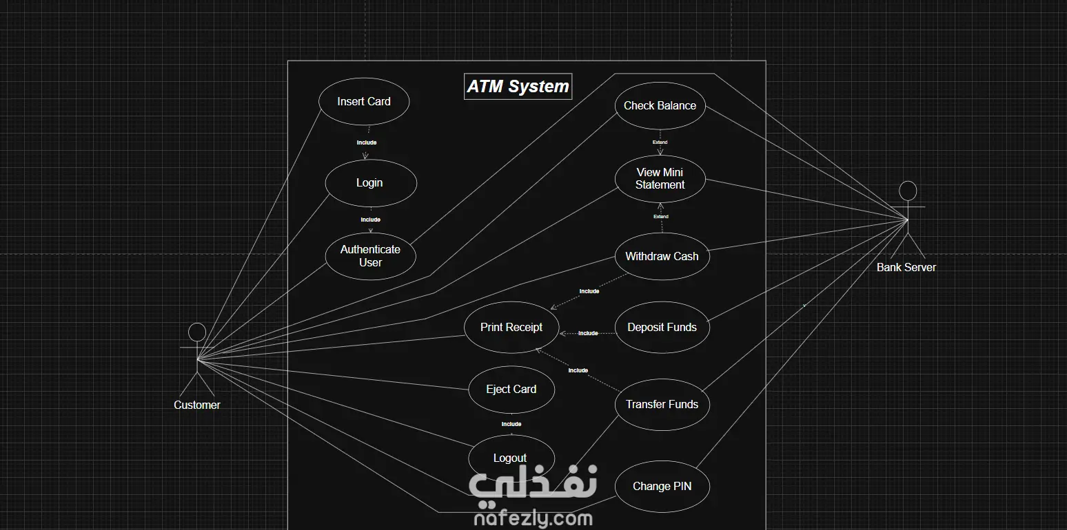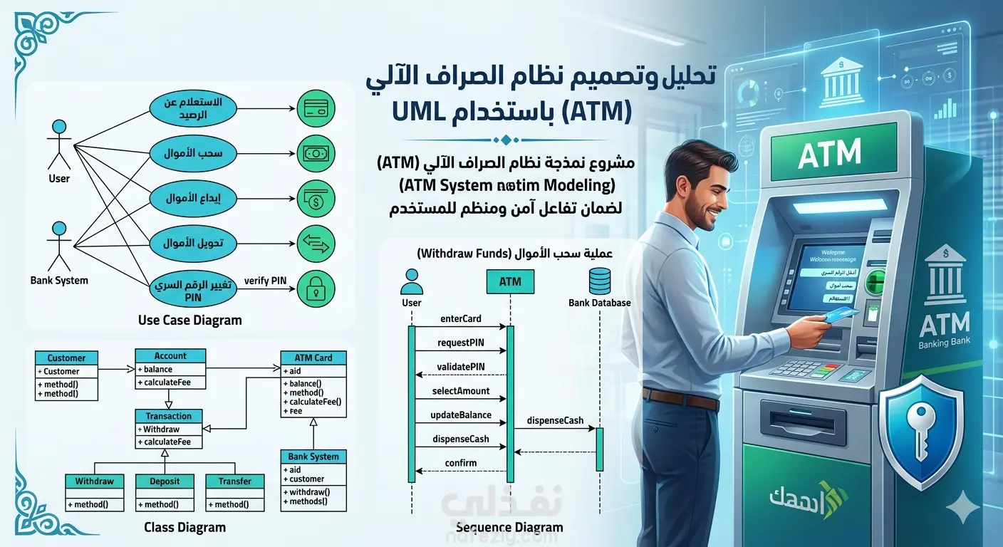 تحليل وتصميم نظام الصراف الآلي باستخدام UML يهدف هذا المشروع إلى تحليل وتصميم نظام الصراف الآلي (ATM) باستخدام تقنيات نمذجة الأنظمة (System Modeling) عبر لغة UML – Unified Modeling Language. يوضح المشروع كيفية تفاعل المستخدم مع نظام الصراف الآلي لتنفيذ العمليات البنكية المختلفة بطريقة آمنة ومنظمة. يسمح النظام للمستخدمين بإجراء مجموعة من العمليات البنكية مثل: الاستعلام عن الرصيد سحب الأموال إيداع الأموال تحويل الأموال تغيير الرقم السري (PIN) يعتمد النظام على التحقق من هوية المستخدم من خلال إدخال الرقم السري (PIN) قبل السماح بتنفيذ أي عملية، مما يضمن مستوى مناسب من الأمان أثناء التعامل مع الحساب البنكي.