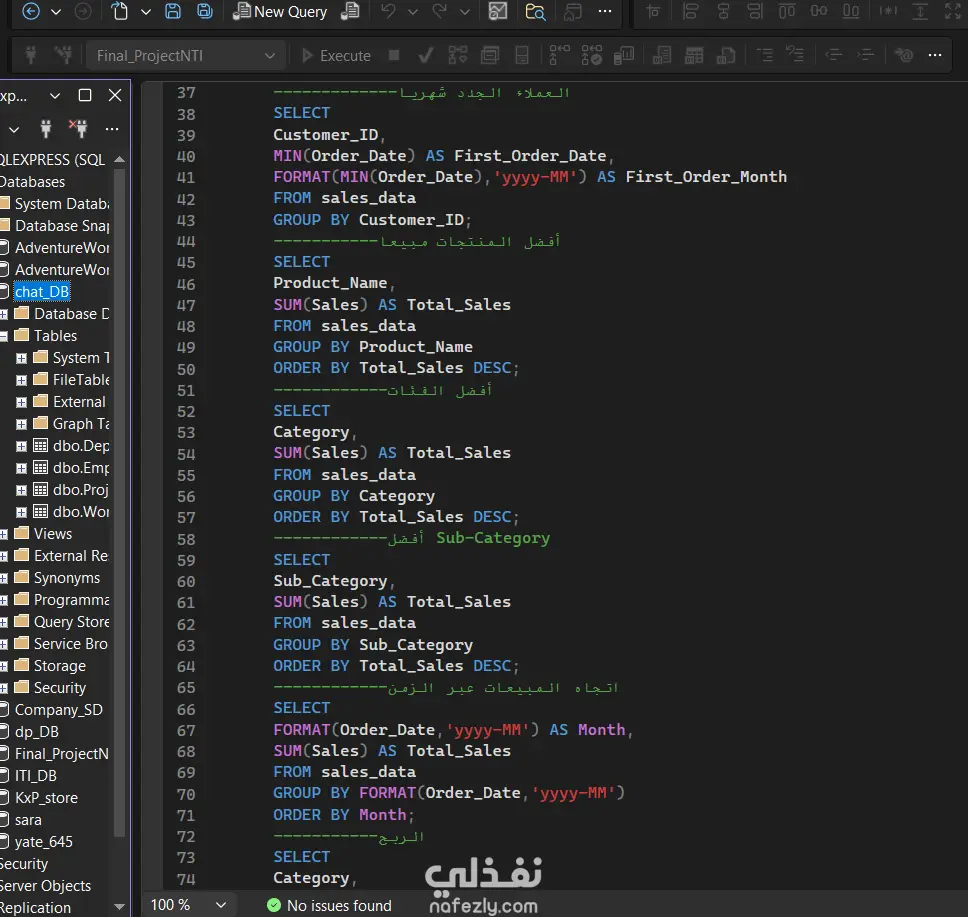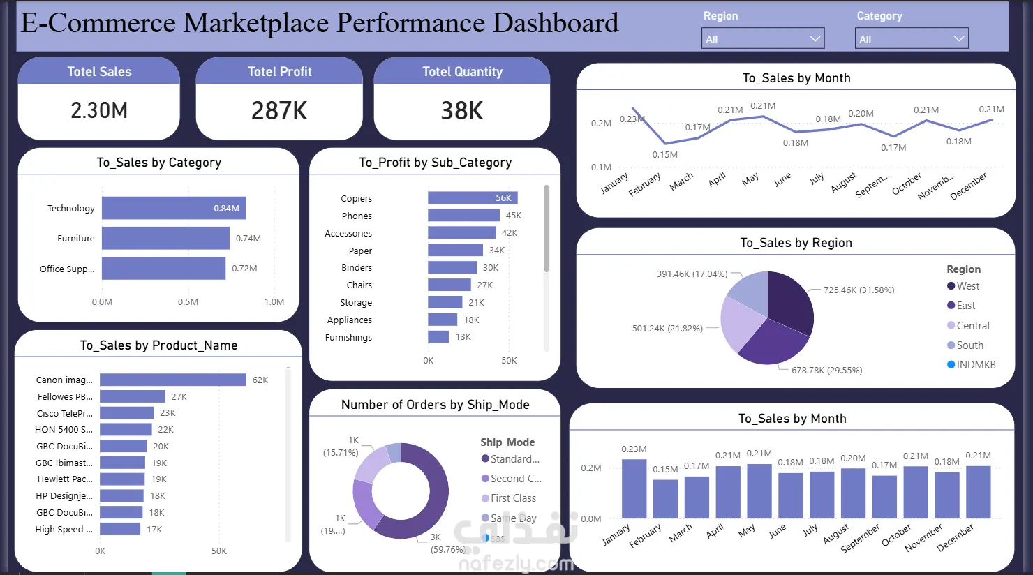الداشبورد ده بيقدم تحليل شامل لأداء منصة تجارة إلكترونية، مع التركيز على أهم المؤشرات زي إجمالي المبيعات، الأرباح، والكمية. وبيوضح توزيع المبيعات والأرباح حسب الفئات والمنتجات، بالإضافة إلى تحليل الأداء الشهري، والمناطق المختلفة، وطريقة الشحن. كمان بيوفر فلاتر تفاعلية بتساعد المستخدم في استكشاف البيانات واتخاذ قرارات مبنية على معلومات دقيقة لتحسين الأداء وزيادة الأرباح.