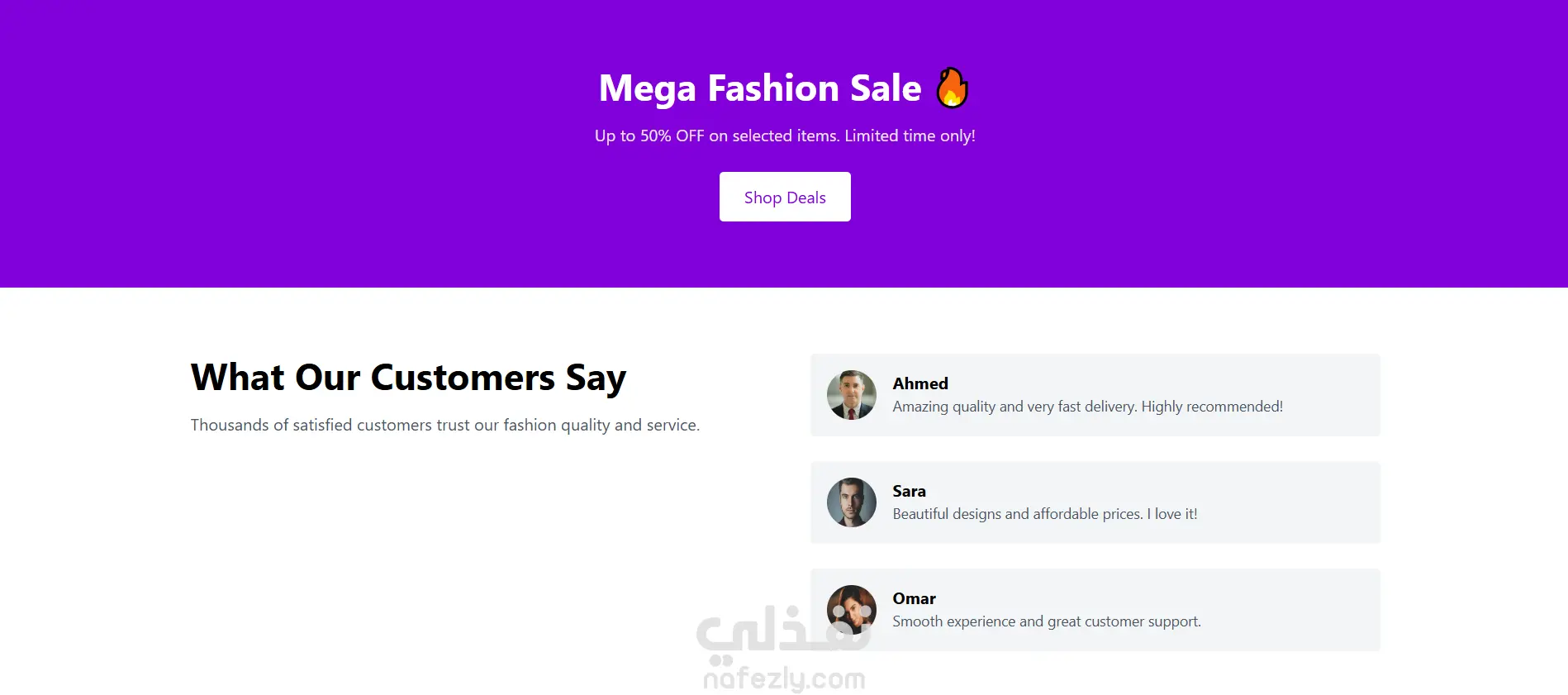 متجر الملابس هذا مصمم بعناية ليوفر تجربة تسوق سلسة وجذابة للمستخدمين. واجهة المتجر أنيقة وعصرية، مع ترتيب واضح للفئات مثل الملابس الرجالية، النسائية، وملابس الأطفال. استخدمنا Tailwind CSS لتصميم واجهة سريعة الاستجابة، مع ألوان متناسقة وعناصر جذابة تضمن تجربة مستخدم ممتعة على جميع الأجهزة. يحتوي المتجر على سلايدر للمنتجات المميزة، أقسام واضحة لكل فئة، وأزرار دعوة لاتخاذ الإجراء (CTA) لتسهيل عملية الشراء.