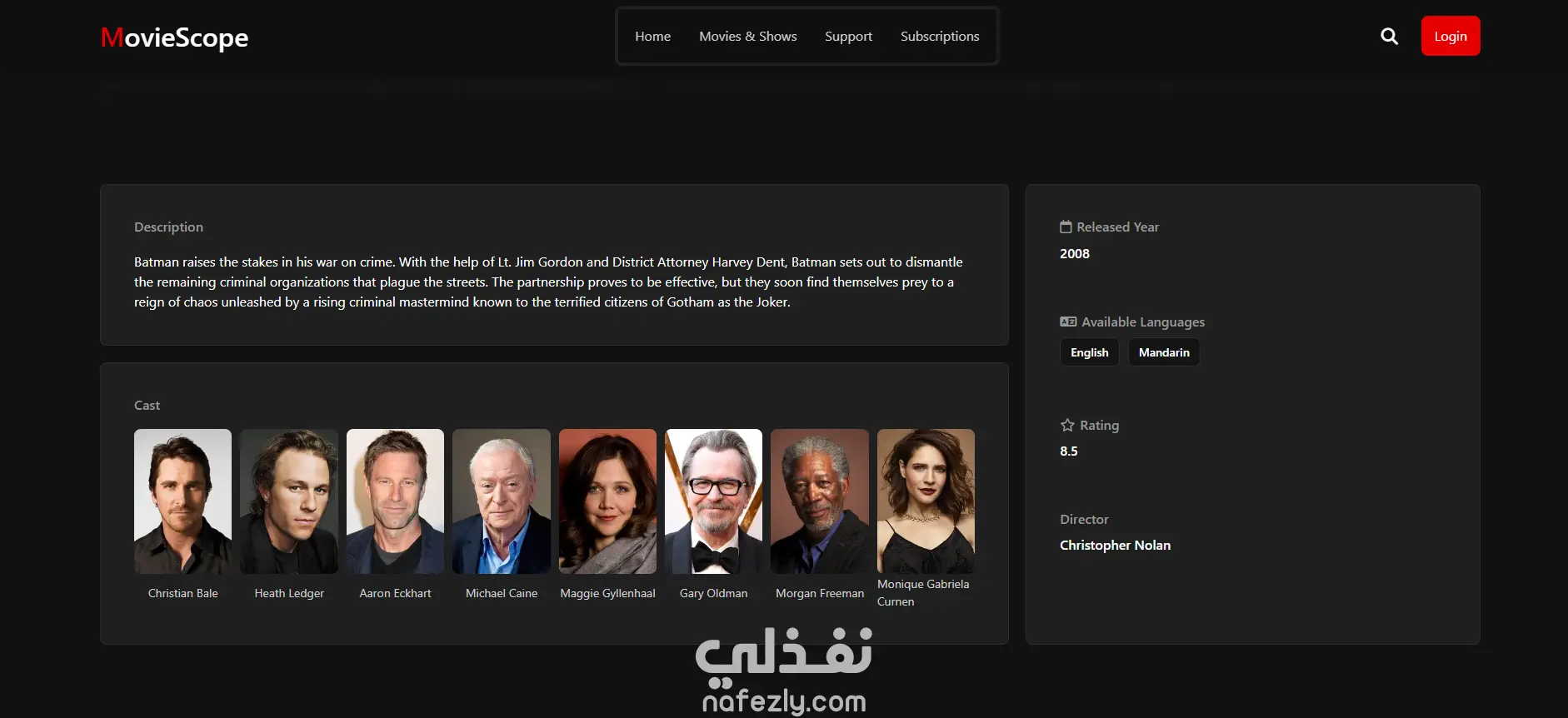يتضمن التطبيق صفحات ديناميكية لكل فيلم تحتوي على معلومات كاملة مثل العنوان، الوصف، الممثلين، التقييم، اللغات، وسنة الإصدار، مع جلب البيانات بشكل مباشر من TMDB API.