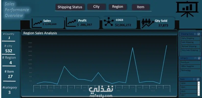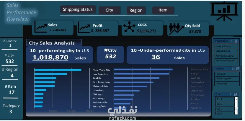 Profit → $286,397 COGS (تكلفة البضاعة المباعة) → $2,006,272 Qty Sold (الكمية المباعة) → 37,873 2️⃣ الإحصائيات الجانبية عدد الدول: 1 عدد المدن: 532 عدد المناطق: 4 عدد المنتجات: 17 عدد الفئات: 3 3️⃣ City Sales Analysis أفضل 10 مدن بإجمالي مبيعات $1,018,870 أسوأ 10 مدن بإجمالي مبيعات $36 عدد المدن الكلي: 532 4️⃣ الفلاتر التفاعلية Shipping Status (حالة الشحن) City (المدينة) Region (المنطقة) Item (المنتج) 5️⃣ الرسوم البيانية بار شارت أفقي للمدن الأعلى أداءً بار شارت أفقي للمدن الأدنى أداءً