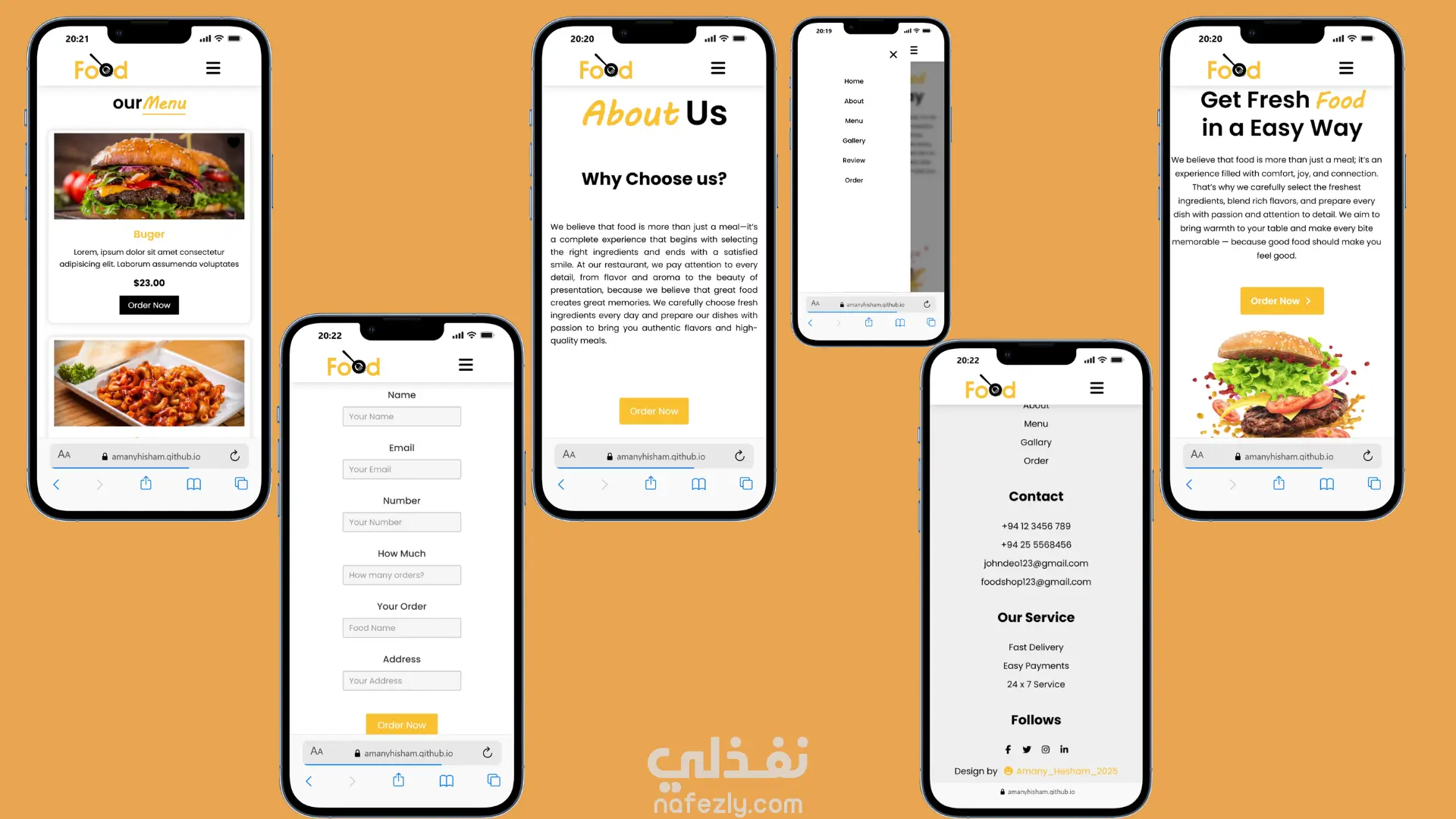 تطوير واجهة ويب متكاملة لعرض منيو مطعم وتوفير نموذج طلب تفاعلي للعملاء. المميزات الرئيسية: تصميم جذاب للوجبات مع عرض للصور والأسعار بشكل واضح. نموذج طلب (Order Form) يحتوي على كافة الحقول اللازمة (الاسم، العنوان، الهاتف، الطلب). قائمة جانبية (Sidebar) للموبايل لتسهيل التنقل داخل الصفحة. تصميم متجاوب تماماً على مستوى (الفون والتابلت).