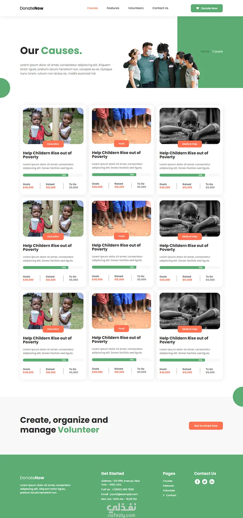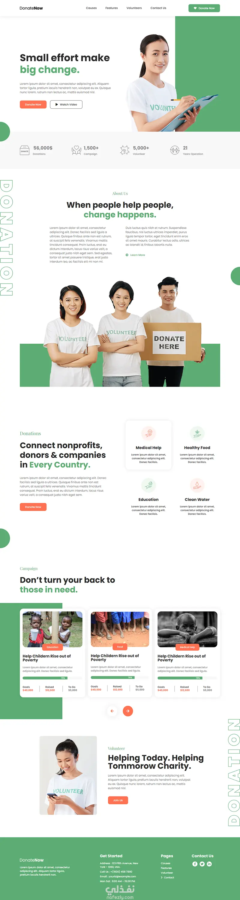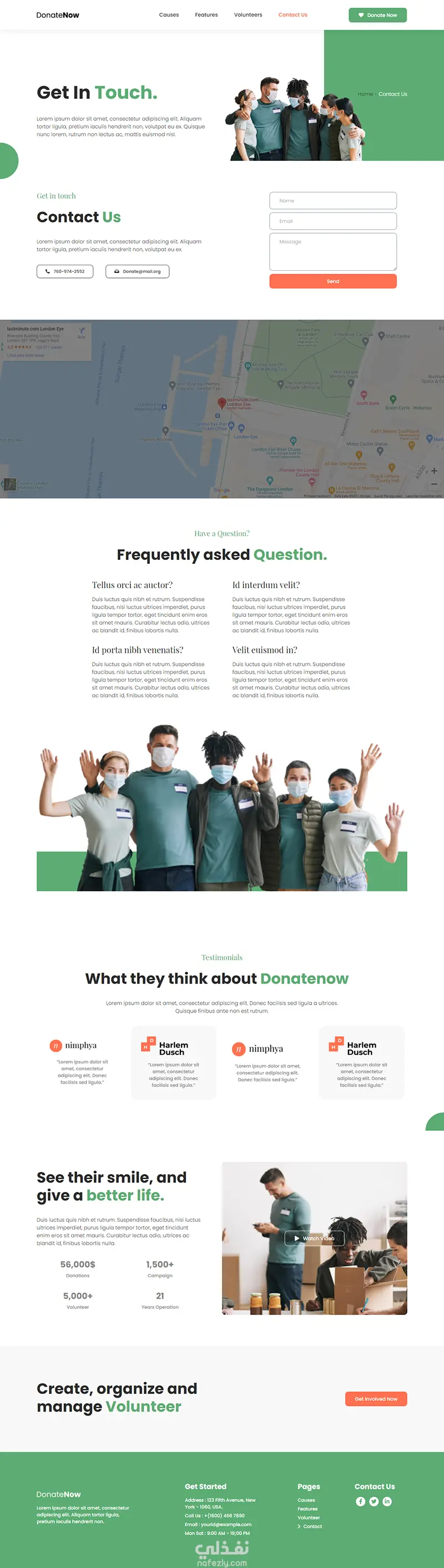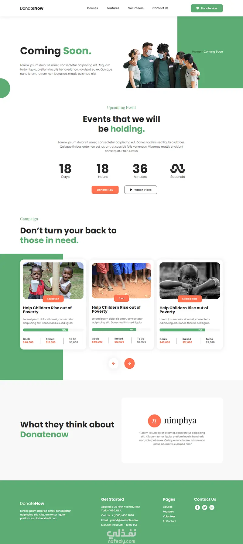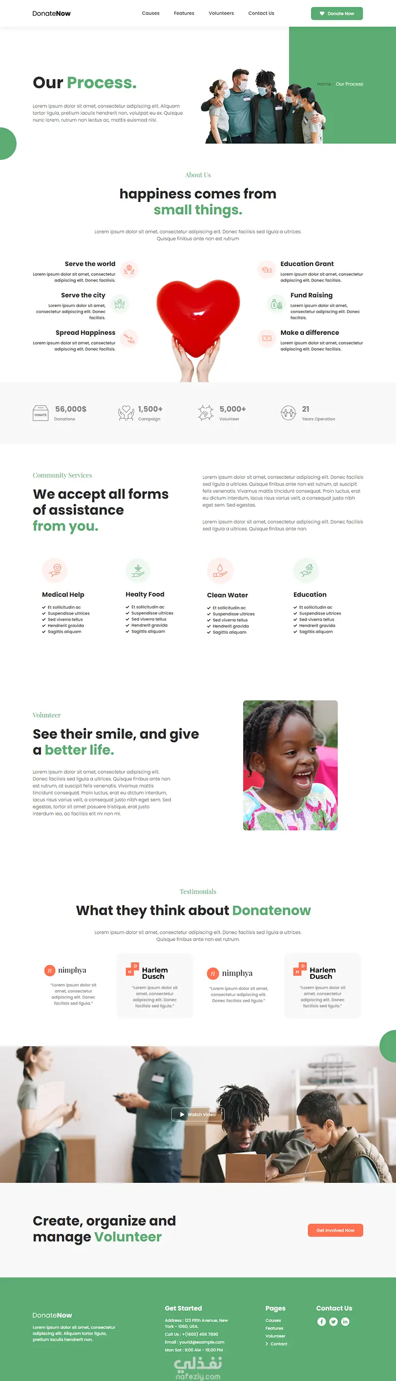 تصميم موقع خيري لجمع التبرعات، مع صفحات للحملات، عرض الحالات الإنسانية، ونظام تبرع أونلاين مع نموذج تواصل
