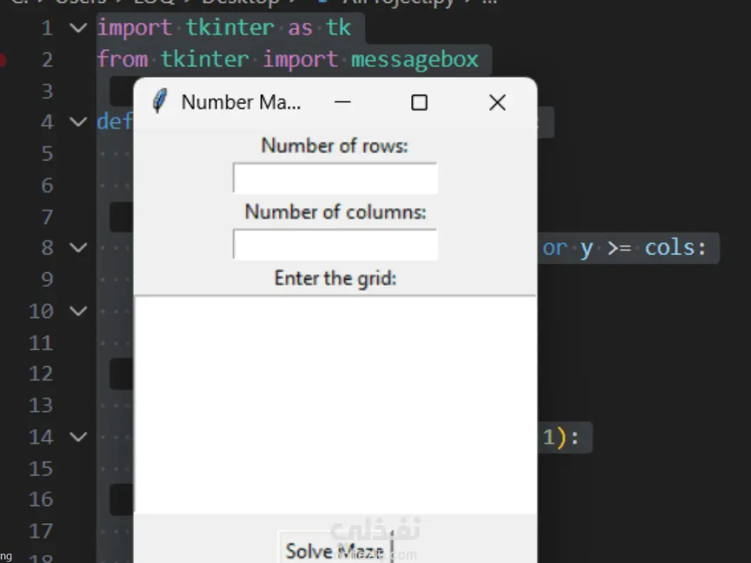 يعرض التطبيق للمستخدم واجهة بسيطة تسمح بإدخال عدد الصفوف والأعمدة وإدخال بيانات المتاهة، ثم يقوم بتحليل المسارات الممكنة وإظهار ما إذا كان هناك طريق للوصول إلى الهدف أم لا. وفي حال وجود مسار صحيح، يتم عرض الطريق الكامل الذي تم اتباعه للوصول إلى النهاية.