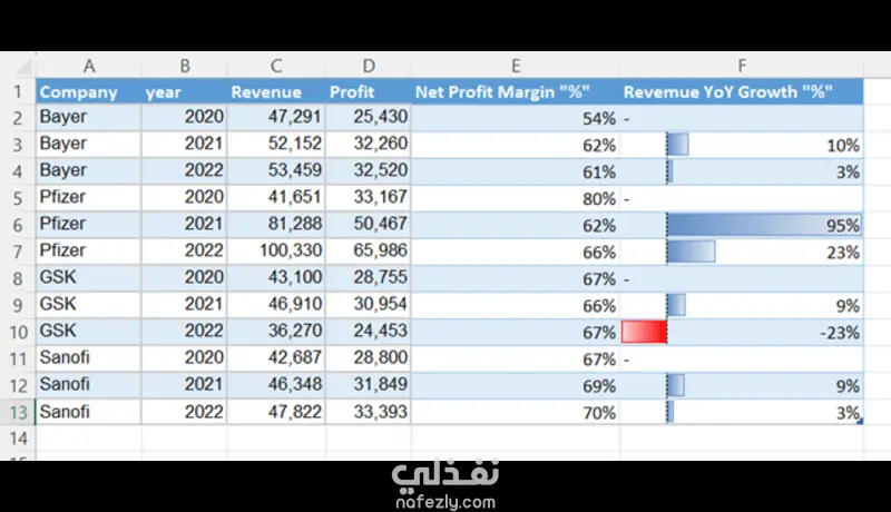 قمت بتحليل مجموعة بيانات مالية لشركات كبرى، وتقديم تقرير تفاعلي يشمل: حساب نسبة النمو السنوي (YoY) وهوامش الربح بدقة استخدام التنسيق الشرطي (Conditional Formatting) لتوضيح الأداء المالي بصرياً تنظيم البيانات في جداول محورية (Pivot Tables) لتسهيل استعراض النتائج تصميم واجهة بيانات (Dashboard) بسيطة وواضحة لصناع القرار