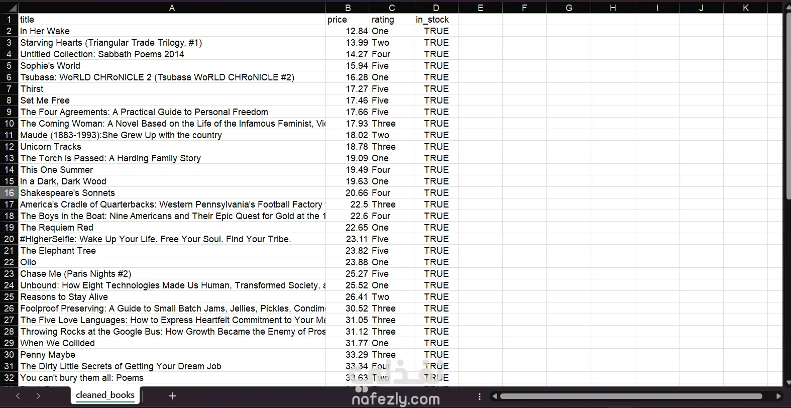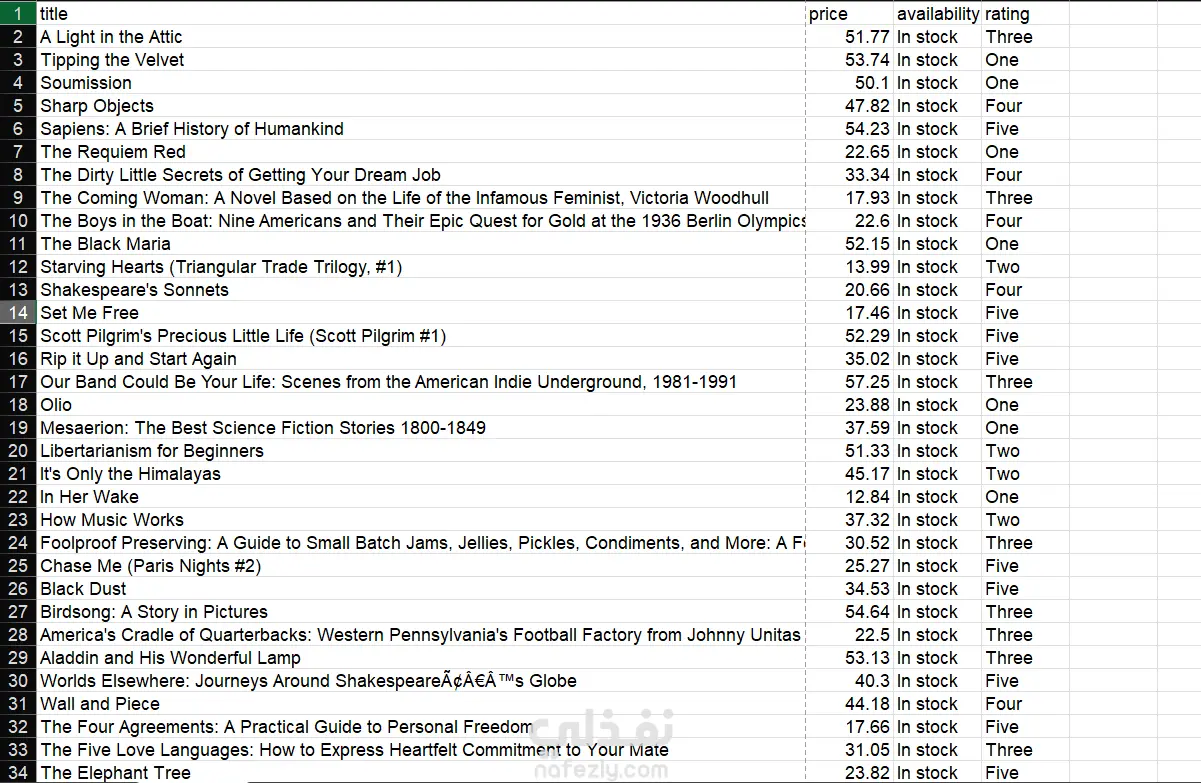 استخراج عناوين الكتب، الأسعار، حالة التوفر، والتقييمات من الموقع بشكل آلي.