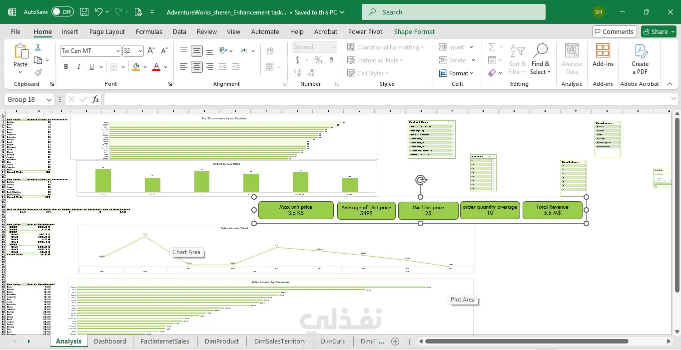 1. وصف المشروع (Brief): مشروع تحليل بيانات استراتيجي لشركة عالمية متخصصة في معدات الرياضة. قمت فيه ببناء نظام تقارير متكامل يربط بين جداول المبيعات الضخمة وقواعد بيانات العملاء والمنتجات، لتحويل أكثر من 5.4 مليون دولار من حجم المبيعات إلى رؤى بصرية واضحة تساعد في اتخاذ القرار. 2. التحديات التي تم حلها (Challenges Solved): نمذجة البيانات المعقدة: ربط جداول متعددة (Fact & Dimension Tables) لضمان دقة التقارير. التحليل الجغرافي: توزيع الأداء حسب الدول (الولايات المتحدة، أستراليا، كندا، فرنسا، ألمانيا، المملكة المتحدة) لاكتشاف الأسواق الأكثر ربحية. تقييم المنتجات والأسعار: تحليل العلاقة بين أسعار المنتجات (UnitPrice) وحجم الطلبات (Order Quantity). 3. التحليلات الفنية المنفذة (Technical Analysis): تحليل المبيعات التاريخي: تتبع النمو من عام 2005 إلى 2008، وتحديد الربع السنوي الأقوى أداءً (Qtr3 من عام 2007 حقق مبيعات تتجاوز 1.1 مليون). تحليل ربحية المنتجات: فرز أكثر من 119 منتجاً مختلفاً بناءً على تكلفة التصنيع مقابل سعر البيع لزيادة هامش الربح. تحليل سلوك العملاء: تصنيف العملاء حسب التكرار وحجم المشتريات (مثل العملاء: Antonio, Devin, Hailey وغيرهم). المقاييس الإحصائية: استخراج المتوسطات الحسابية لأسعار الوحدات (متوسط $548) والحدود الدنيا والعليا للأسعار. 4. الأدوات المستخدمة: Advanced Excel & Data Modeling: استخدام Power Pivot لربط الجداول (Relationships). Power Query: لتنظيف الجداول الضخمة ومعالجة البيانات الجغرافية. Business Intelligence Dashboard: تصميم لوحة تحكم تعرض مؤشرات الأداء الرئيسية (KPIs) بشكل احترافي.