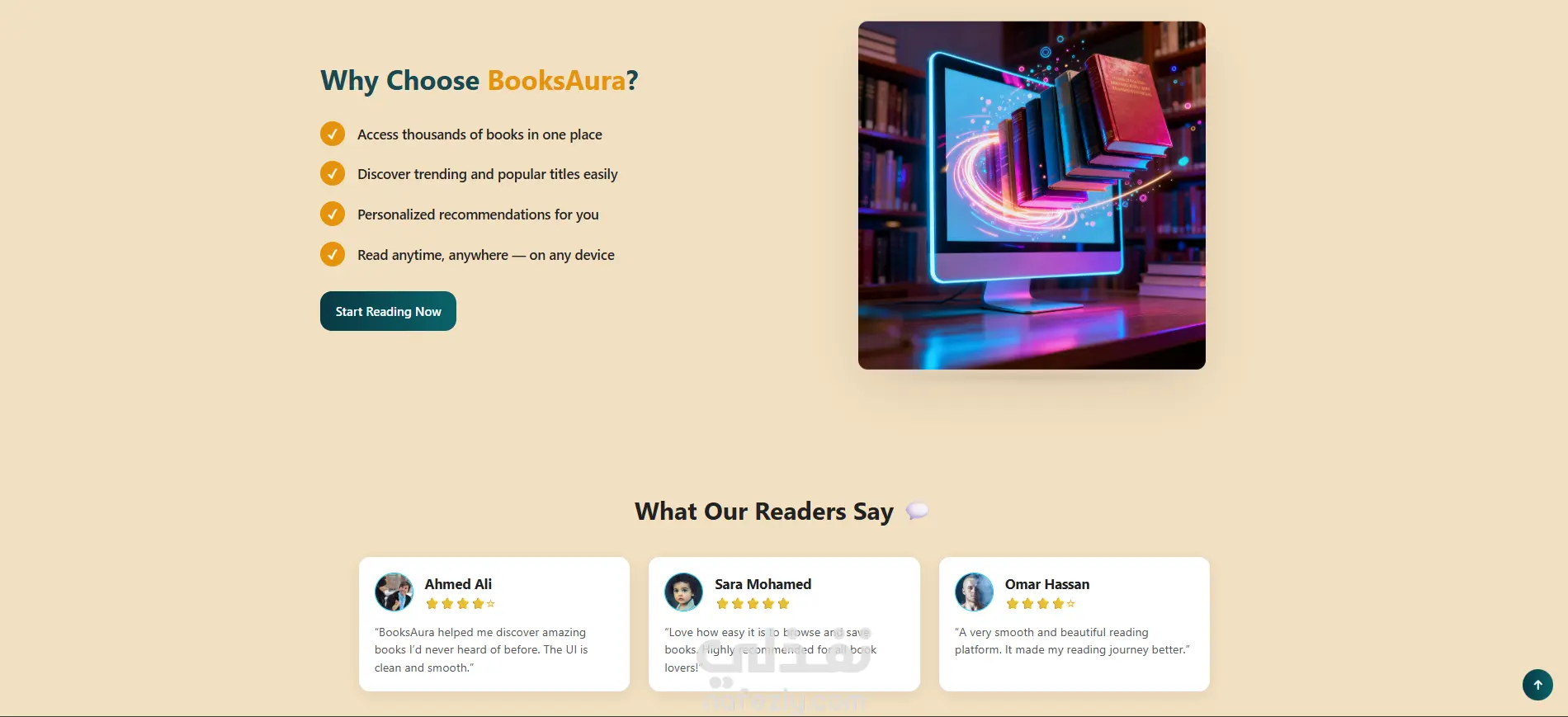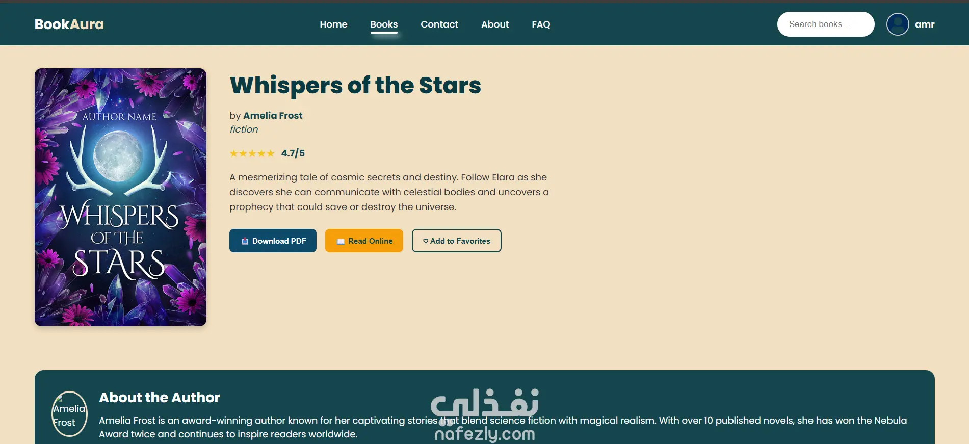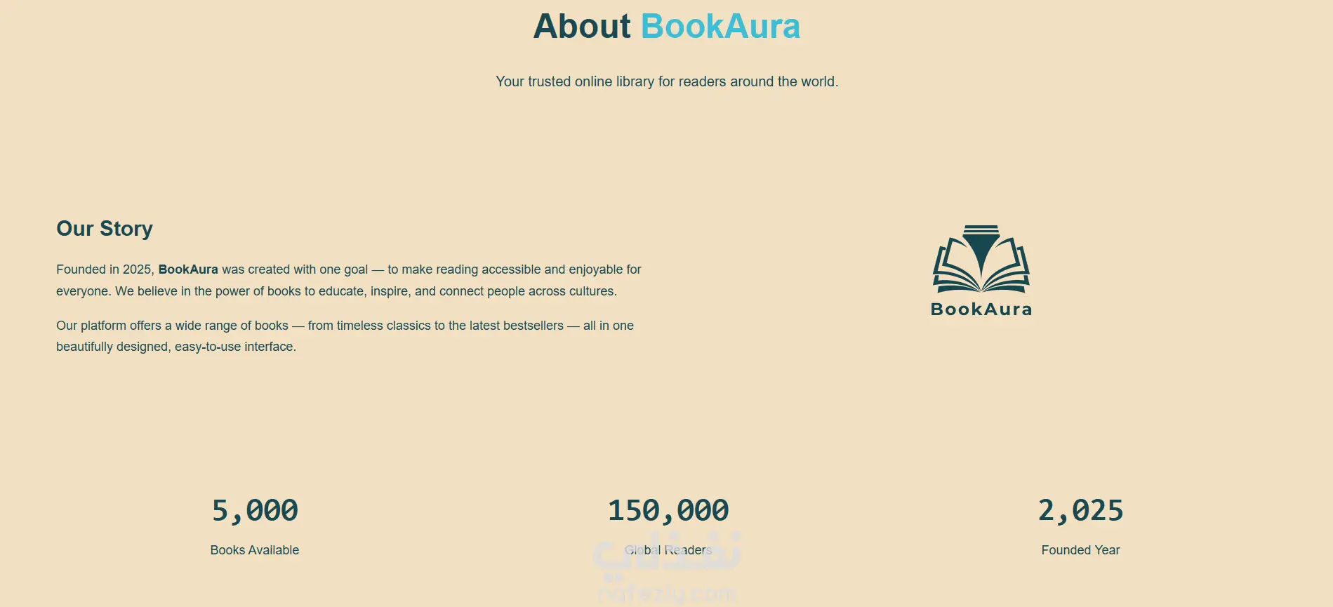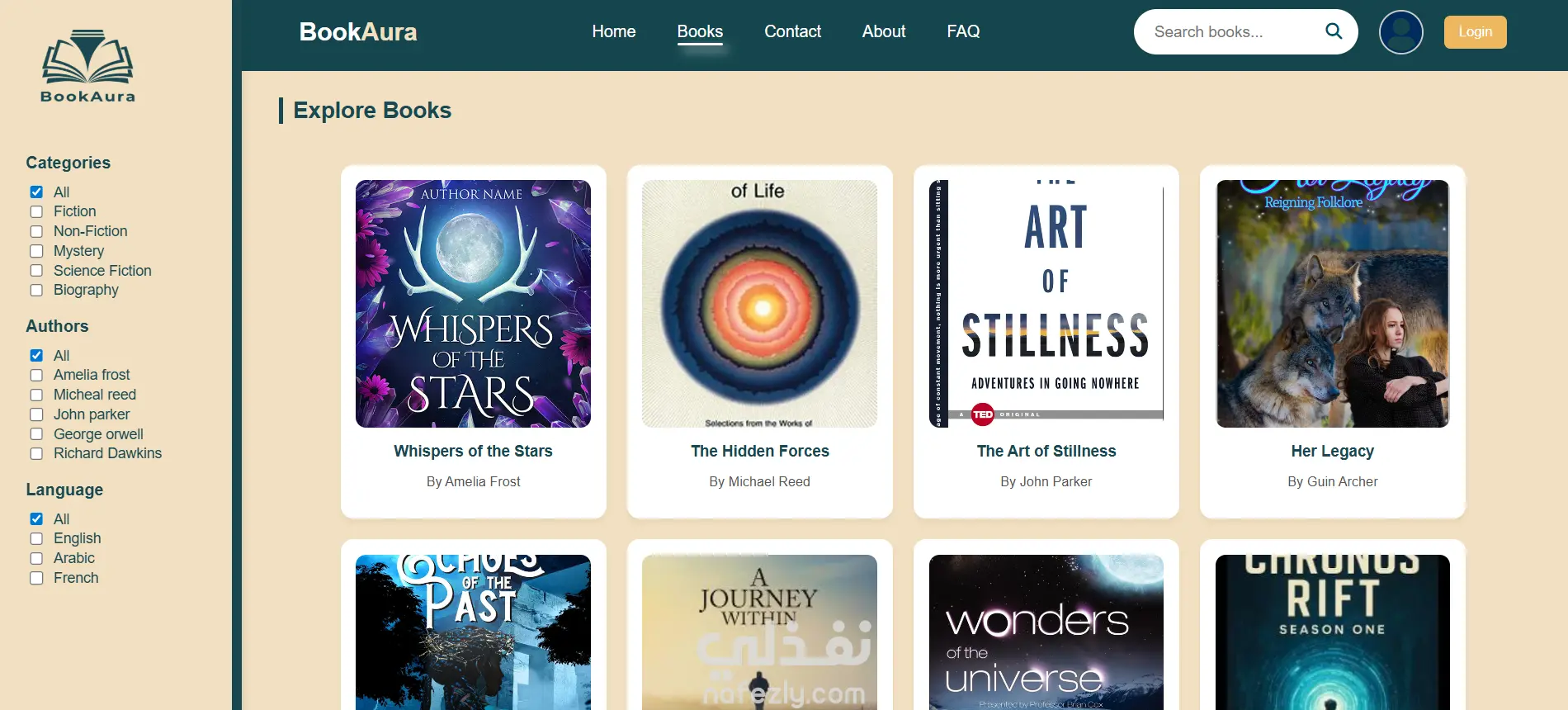 قمت بتطوير موقع BookAura وهو منصة مكتبة إلكترونية تتيح للمستخدمين تصفح الكتب وعرضها بطريقة منظمة وسهلة الاستخدام.