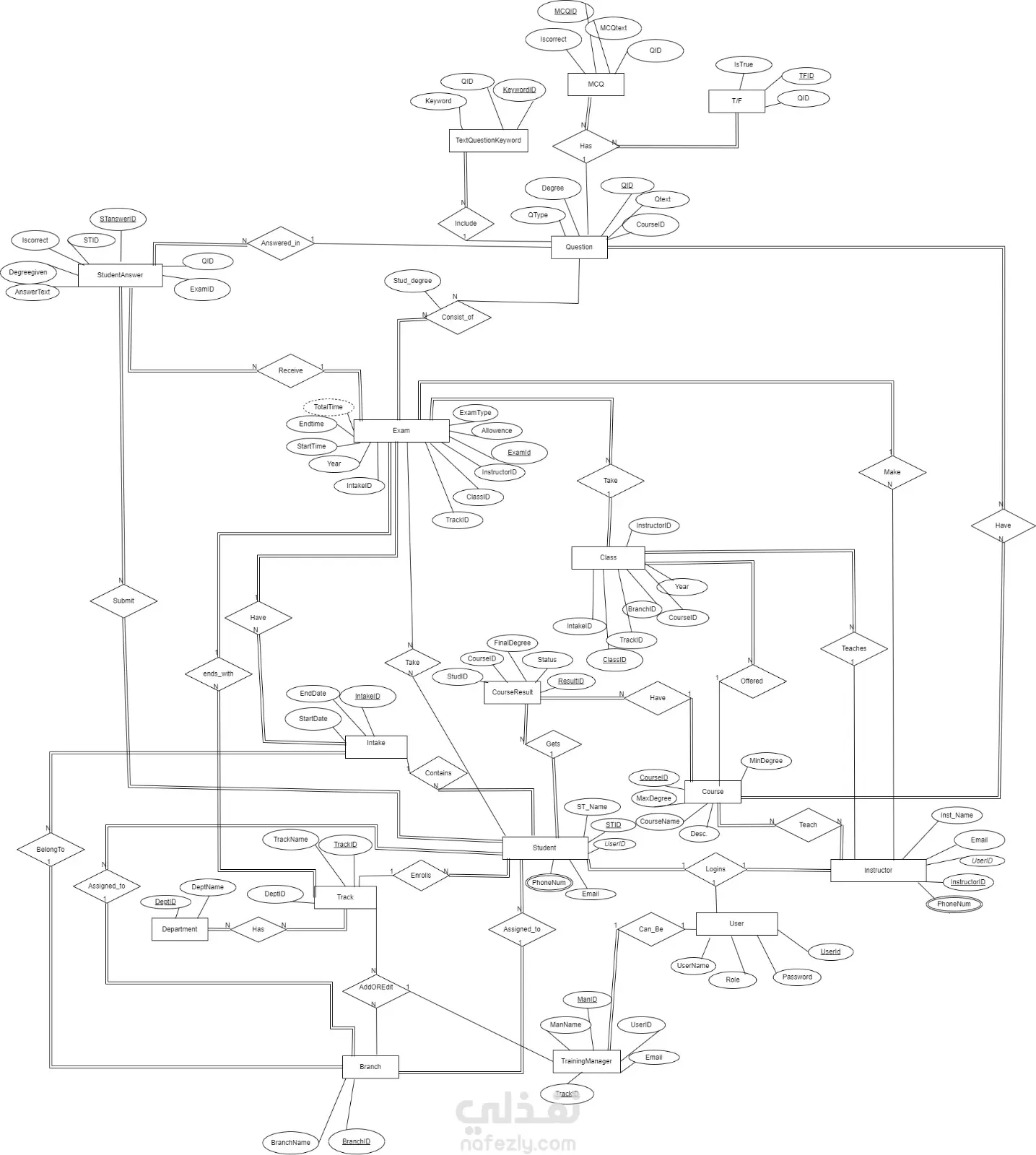 نظام قاعدة بيانات علائقية متكاملة مبنية على Microsoft SQL Server لإدارة الامتحانات الأكاديمية، يشمل تصميم 27 جدولاً مُعيَّراً، و26 Stored Procedure تغطي جميع العمليات من تسجيل الطلاب وتوليد الامتحانات العشوائية إلى احتساب النتائج تلقائياً، إضافةً إلى 8 Triggers لتطبيق قواعد العمل، و26 View موزعة على أدوار مختلفة (طالب، مدرب، مدير، مسؤول). يدعم النظام ثلاثة أنواع من الأسئلة: اختيار من متعدد، صح وخطأ، وأسئلة نصية.