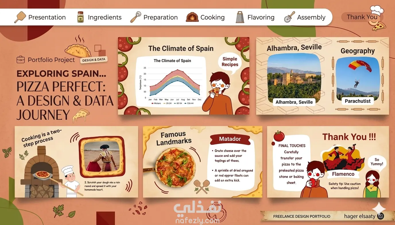 في هذا المشروع، قمت بتصميم عرض تقديمي متكامل يجمع بين الجانب المعلوماتي والجمالي، مخصص لتقديم وصفات الطعام بطريقة "الإنفوجرافيك" الجذابة. تم التركيز على تحويل الخطوات التقليدية إلى تجربة بصرية سهلة الفهم. أهم ما يميز هذا العمل: هوية بصرية مخصصة: اختيار ألوان دافئة (Terra-cotta & Beige) تعزز من جاذبية المحتوى الغذائي. تصميم أيقونات فريدة: دمج أيقونات مخصصة لكل مرحلة (تحضير، طهي، تزيين) لسهولة التصفح. تبسيط البيانات: تحويل النصوص الطويلة إلى نقاط مركزة ورسوم توضيحية (Illustrations) متناسقة. تنظيم احترافي: توزيع الشرائح بشكل شبكي يضمن تسلسل الأفكار من العنوان وحتى الخاتمة. قابلية التعديل: التصميم مُعد ليكون مرناً وقابل للتعديل بما يتناسب مع احتياجات العميل المختلفة. الأدوات المستخدمة: PowerPoint / Canva