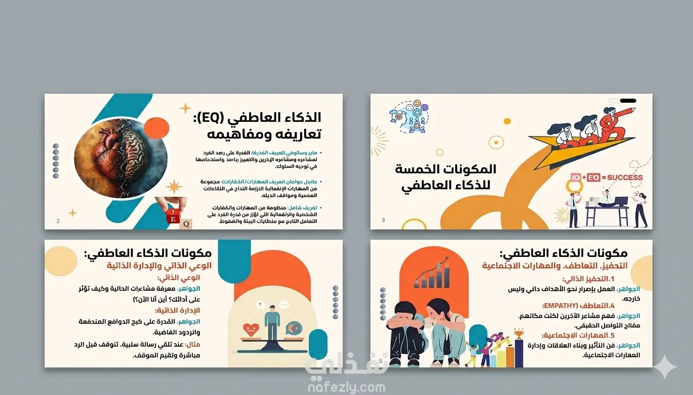 تصميم حقيبة تدريبية متكاملة تتناول مفهوم الذكاء العاطفي ومكوناته الخمسة. استخدام رسوم توضيحية (Illustrations) عصرية ومريحة للعين لتبسيط المفاهيم المعقدة. تنسيق المحتوى النصي بشكل يسهل القراءة مع مراعاة الهوية البصرية المتناسقة. العرض جاهز للاستخدام في الدورات التدريبية أو المحاضرات الجامعية.