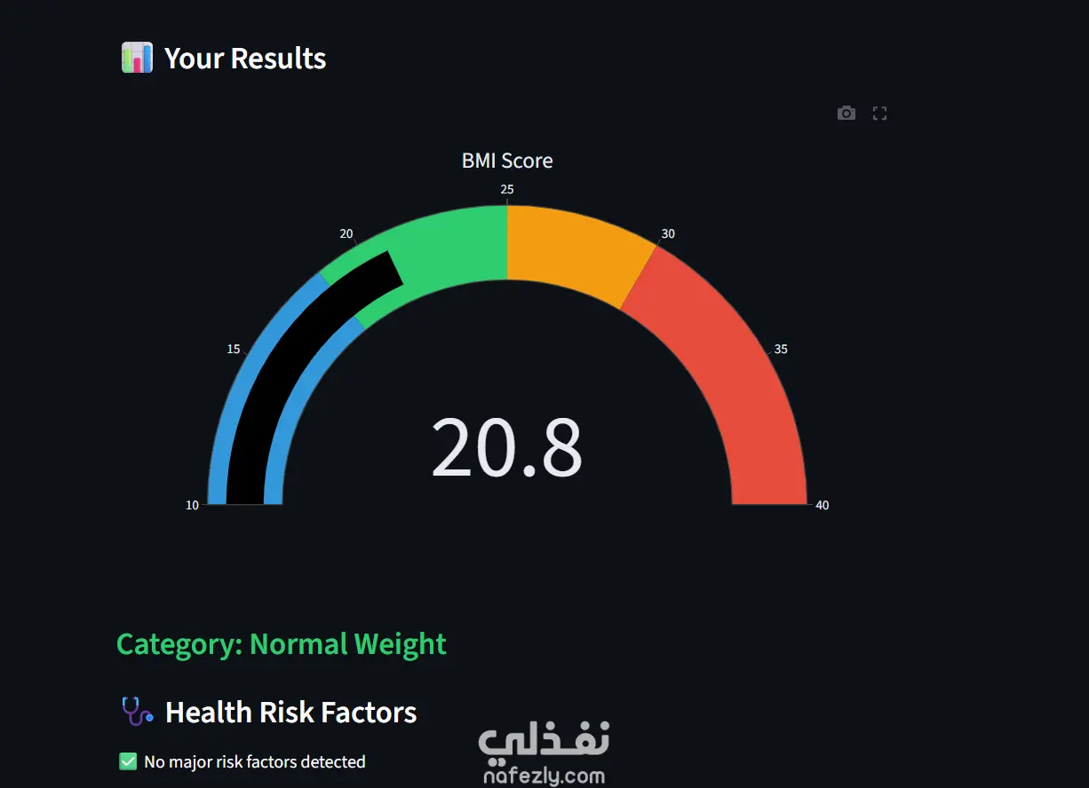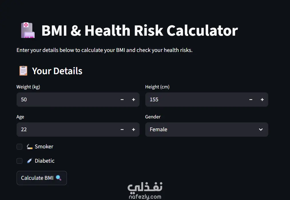ده مشروع حاسبة BMI مع تقييم المخاطر الصحية — بيحسب مؤشر كتلة الجسم ويقيّم المخاطر الصحية المرتبطة بيه. الفكرة الأساسية: المستخدم بيدخل الطول والوزن (وممكن بيانات زيادة زي العمر والجنس ونسبة الدهون) والتطبيق بيطلع: قيمة الـ BMI التصنيف (نحيف / طبيعي / زيادة وزن / سمنة) تقييم المخاطر الصحية المرتبطة (أمراض القلب، السكري، ضغط الدم...)