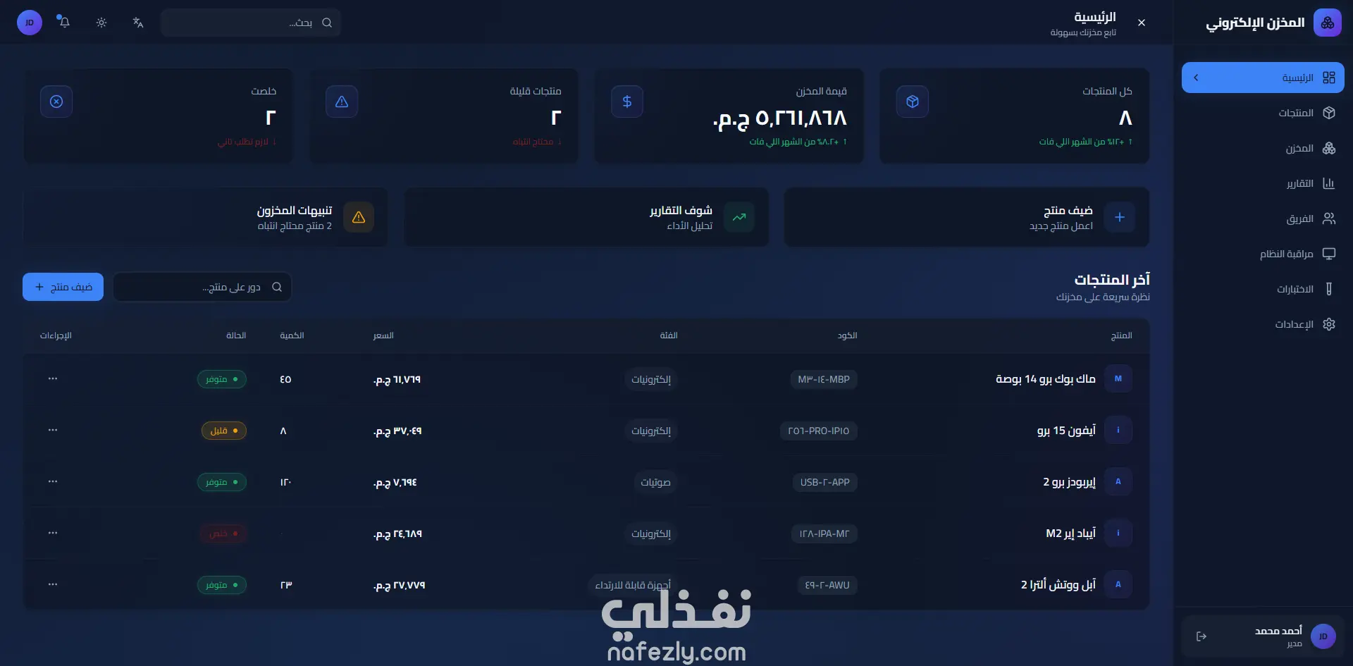 إي-إنفنتوري منصة إدارة مخزون شاملة وحديثة مبنية بـ React 18 وTypeScript وshadcn/ui. تغطي كامل عمليات المخزون: إضافة وتعديل وحذف المنتجات مع استيراد وتصدير CSV/Excel بالجملة، وتتبع مستويات المخزون في الوقت الفعلي عبر مستودعات متعددة، وتنبيهات انخفاض المخزون، وسجل تدقيق كامل لكل معاملة.