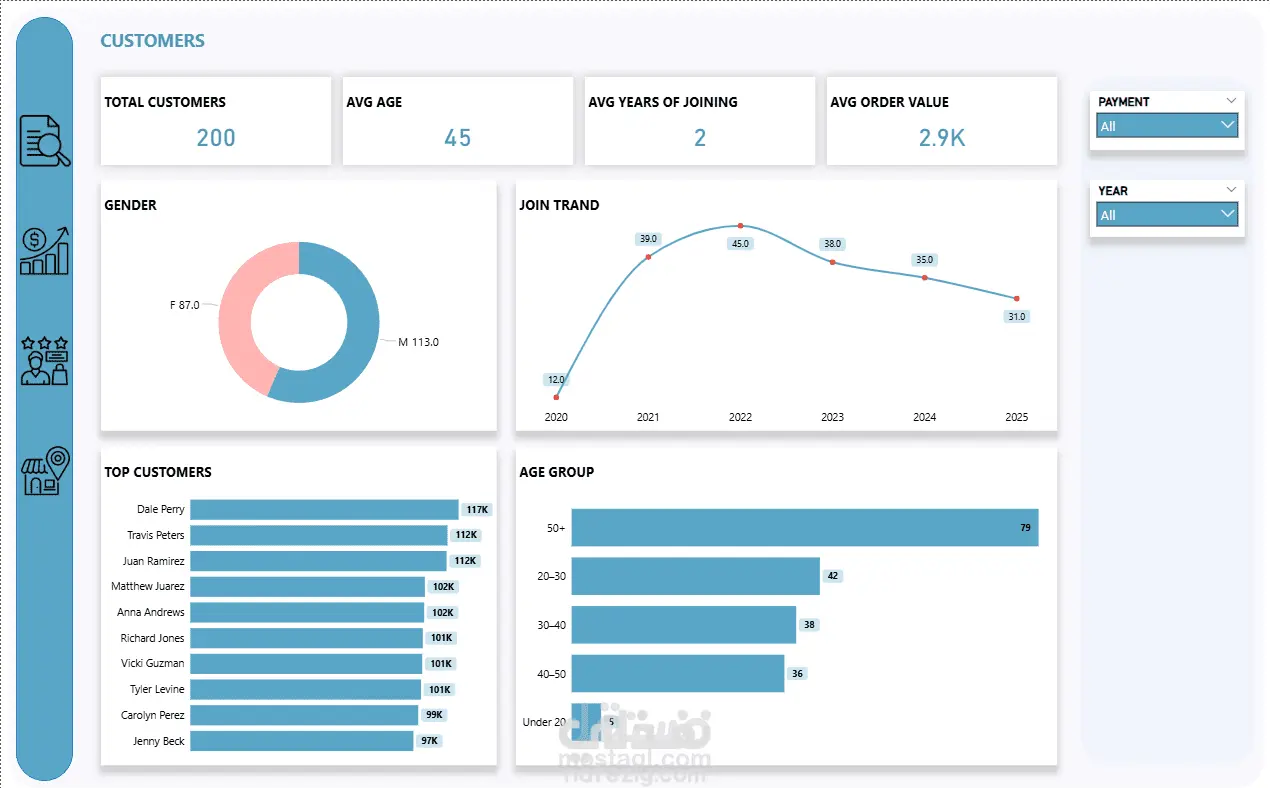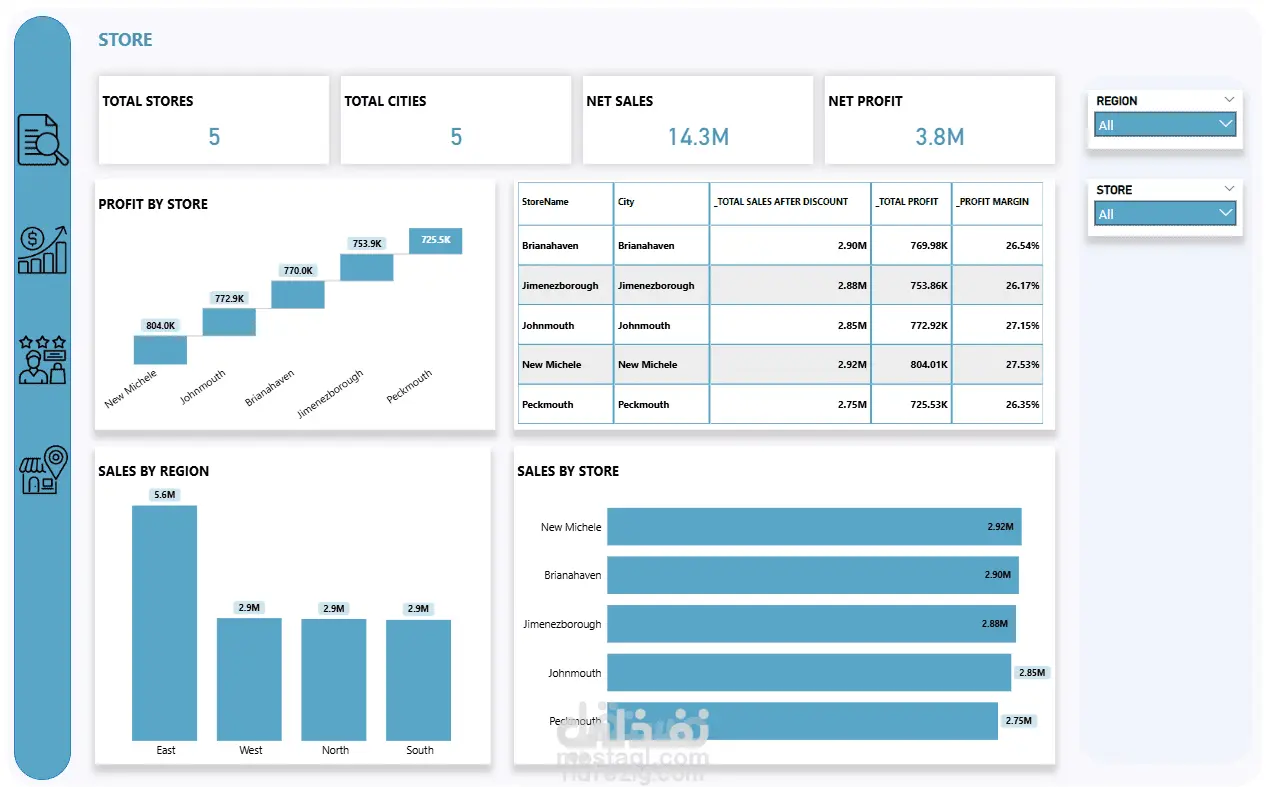 تم تصميم وتطوير داشبورد تفاعلي باستخدام Power BI لتحليل بيانات المبيعات والعملاء والمتاجر، بهدف تحويل البيانات الخام إلى رؤى واضحة تساعد في اتخاذ قرارات استراتيجية مبنية على البيانات.