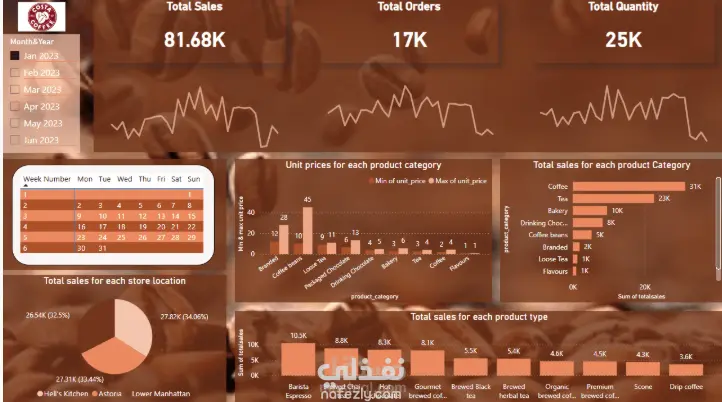 تم تصميم لوحة تفاعلية لعرض وتحليل مبيعات كوستا كوفي باستخدام Power BI، تشمل إجمالي المبيعات والطلبات والكميات، مع تحليل حسب الفروع والفئات والمنتجات. تم تنظيف وتجهيز البيانات باستخدام SQL لضمان دقة النتائج ووضوحها.