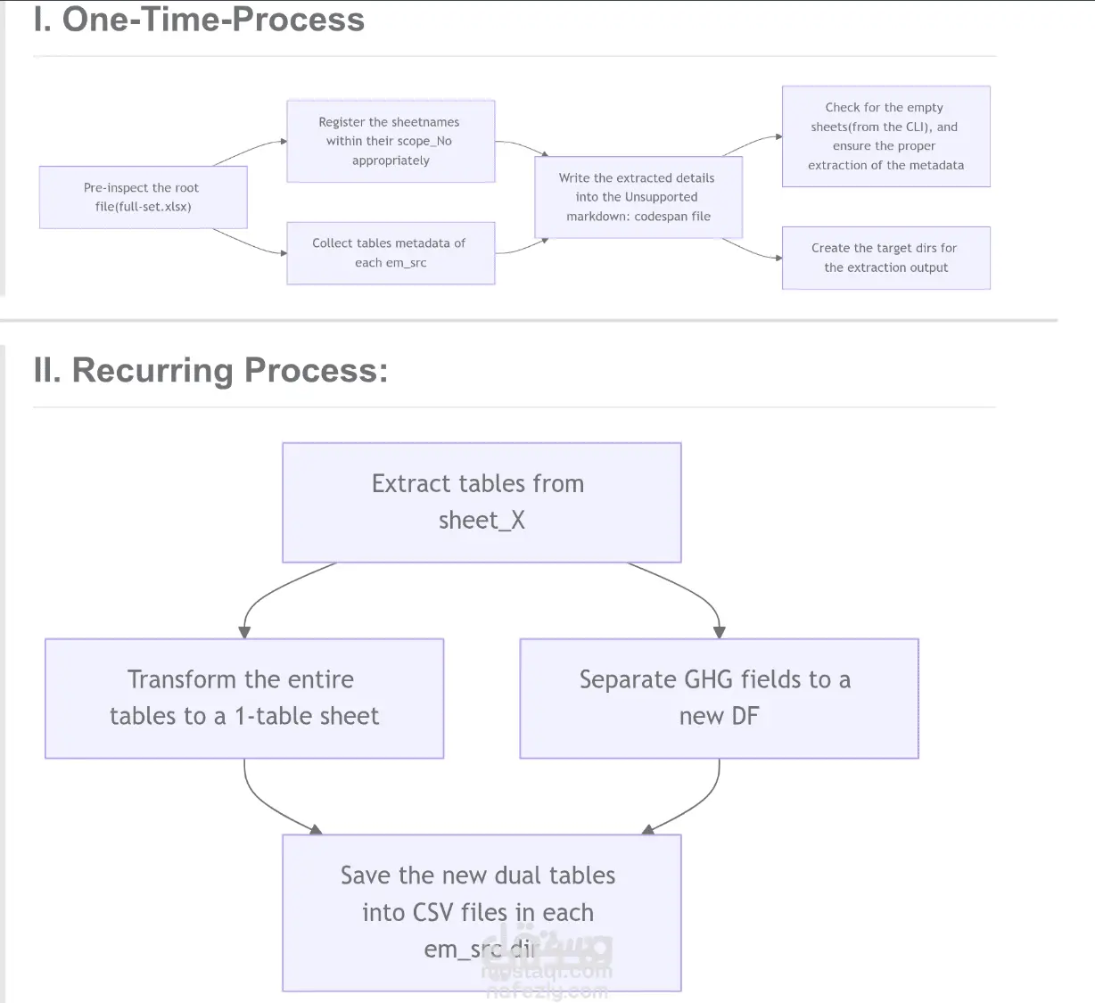 “عوامل التحويل الحكومية للإبلاغ عن غازات الدفيئة مخصصة للاستخدام من قبل المملكة المتحدة والمنظمات الدولية للإبلاغ عن بعض انبعاثات غازات الدفيئة.” هذه هي البيانات التاريخية المطلوبة من جانبنا، حتى نتمكن من إجراء الحسابات للتحليل المناسب المقدم للعميل، وتتغير عوامل التحويل هذه على أساس سنوي. ويتم هذا الغرض عن طريق إنشاء ما يسمى ETL (استخراج | تحويل | تحميل) خط الأنابيب. _______________ المزايا: - أدوات جاهزة للاستخدام للمنتجات ذات الصلة (مثل SQL Server وExcel) - يكتشف بشكل استباقي بعض المشكلات المعرضة للأخطاء، أي قبل تشغيل التطبيق الذي تم تنفيذه. - الكشف التلقائي عن أنواع البيانات لمعظم تنسيقات البيانات (على سبيل المثال من .xlsx أو dbo.) إلى جانب القدرة على تخصيصها. - تتم إدارة SoC (فصل الاهتمامات) عن طريق فصل التصميم على مستوى العميل عن التفاصيل ذات المستوى المنخفض في علامات تبويب منفصلة. _______________ طريقة تنفيذه: 1. استخراج المخطط (نص Python): يقوم نص Python الخاص بك بتحليل ورقة Excel شبه المنظمة. فهو يحدد مكان بدء كل جدول منطقي وانتهائه، ويكتشف أسماء الأعمدة وترتيبها، وربما يستنتج أنواع البيانات. الهدف هو إجراء هندسة عكسية لمخطط البيانات. 2. بيان المخطط (ملف JSON): يقوم البرنامج النصي Python بعد ذلك بكتابة هذا المخطط المستخرج في ملف JSON منظم. يحتوي هذا الملف على جميع المعلومات اللازمة لخط الأنابيب لتحليل البيانات الأولية بشكل صحيح، مثل: أ. أسماء الجداول ب. صفوف البداية والنهاية لكل جدول ج. عناوين الأعمدة بالترتيب الصحيح 3. الابتلاع الديناميكي (خط الأنابيب): أصبح خط الأنابيب الآن مرنًا للغاية. بدلاً من وجود منطق تحليل مبرمج، فإنه ببساطة يقرأ بيان مخطط JSON. ويستخدم هذه التعليمات لاستهداف كتل البيانات الصحيحة بدقة في ملف Excel، وتطبيق أسماء الأعمدة الصحيحة، ثم معالجة البيانات.