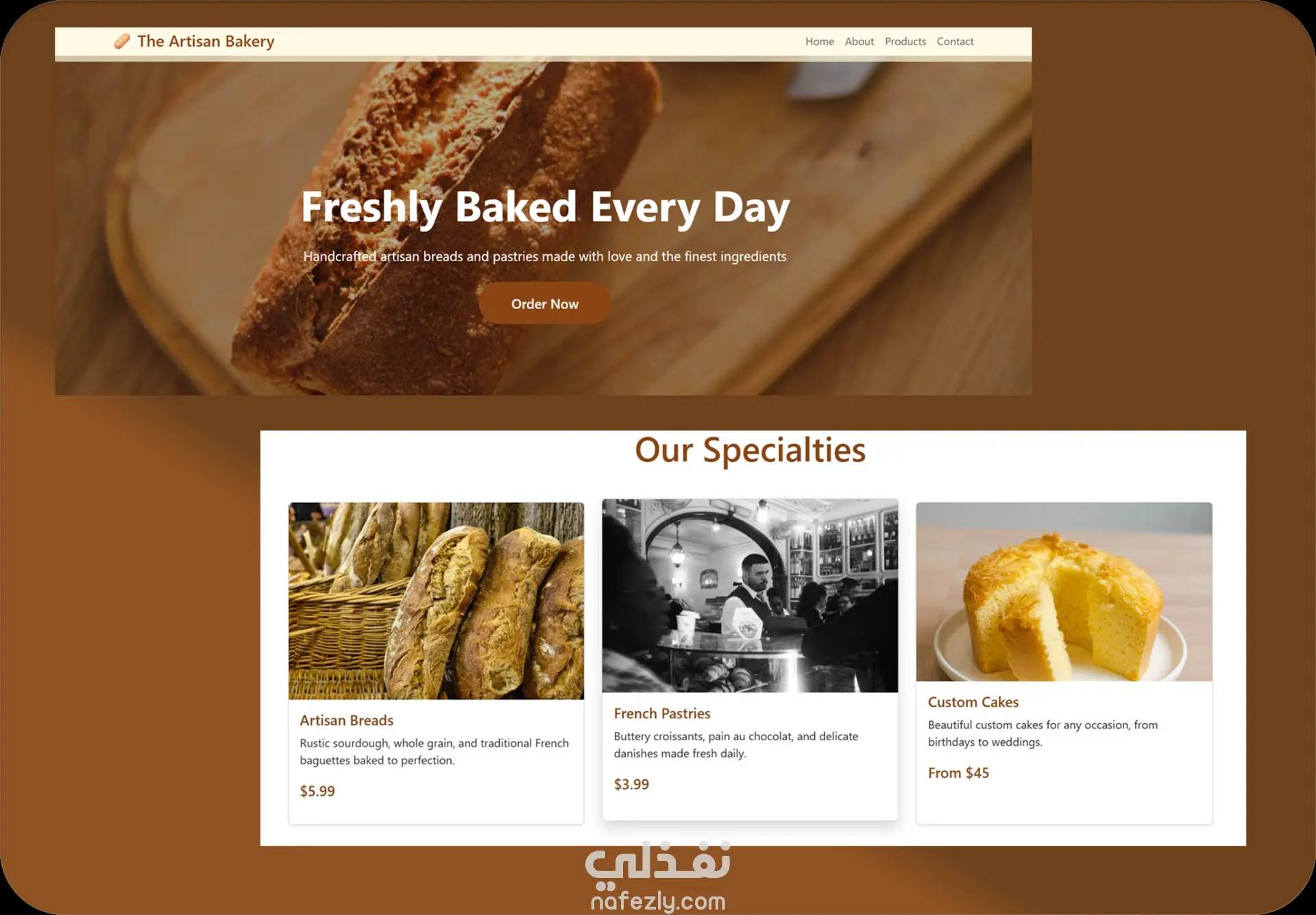 تصميم وتطوير صفحة هبوط متكاملة لمخبز، تهدف إلى عرض المنتجات الطازجة بشكل بصري جذاب وتحفيز الزوار على الطلب أو التواصل. ركزت في المشروع على الجمع بين "جماليات التصميم" و"كفاءة الكود" لضمان تجربة مستخدم سلسة وسريعة.
