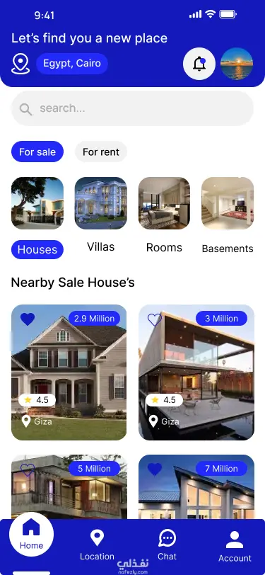 لقد قمت بتصميم واجهات تطبيق متخصص في تأجير المساحات (سواء كانت غرفاً للسكن، بيوت كاملة، أو حتى "بدرومات" ومساحات للتخزين). الفكرة الأساسية من التصميم هي جعل عملية البحث والتأجير سهلة جداً للمستخدم العادي.