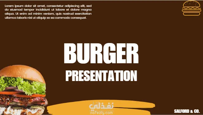 النص المركزي: تتوسط الصورة كلمتا "BURGER" بخط أبيض كبير جداً وعريض، وأسفلها مباشرة كلمة "PRESENTATION" بخط أبيض عريض ولكن بحجم أصغر، مما يبرز عنوان العرض التقديمي أو التصميم.
