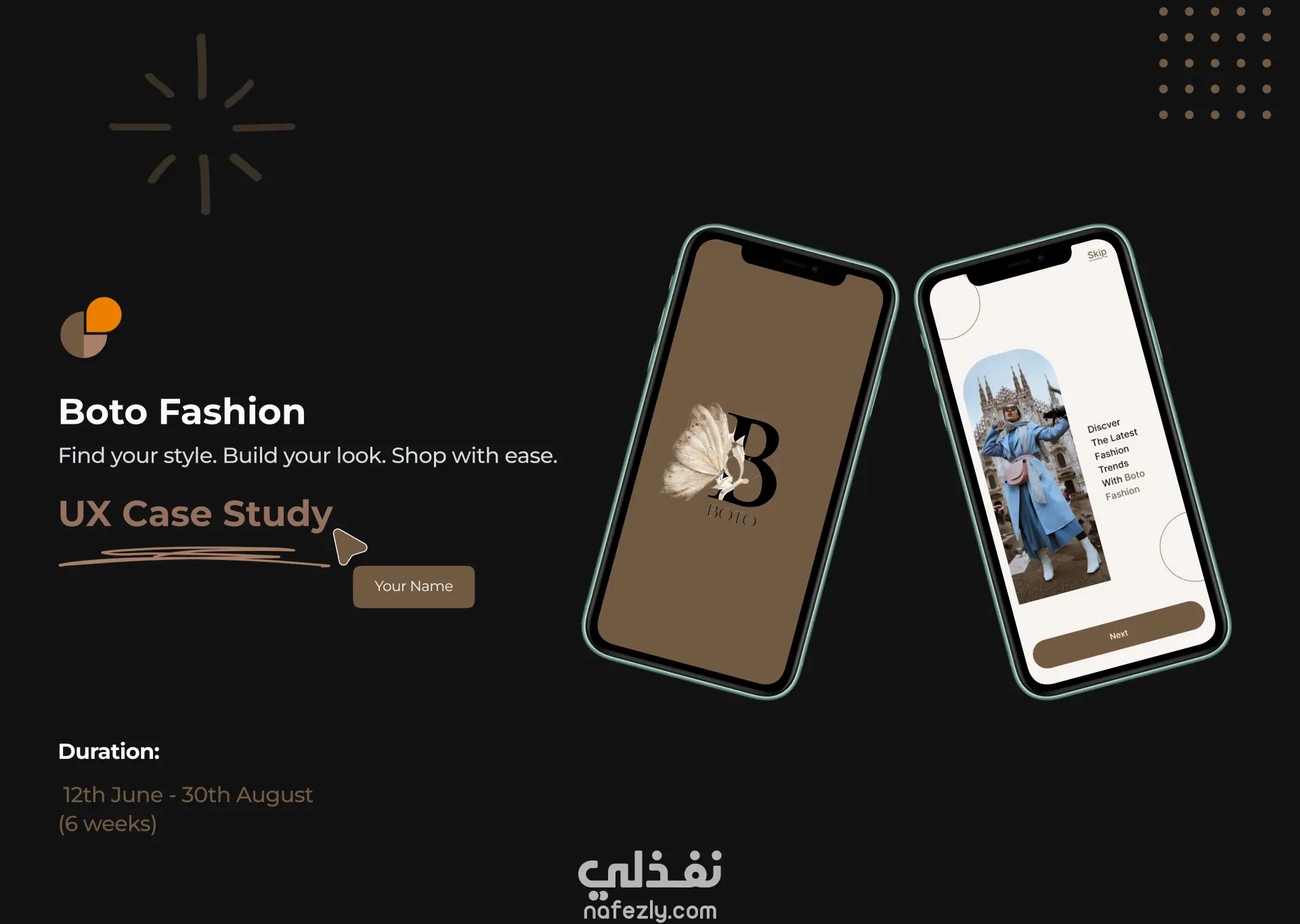 اعتمد التصميم على أسلوب عصري مع استخدام ألوان وخطوط مناسبة لطبيعة تطبيقات الأزياء، مع مراعاة تجربة المستخدم وسهولة التنقل بين الشاشات.