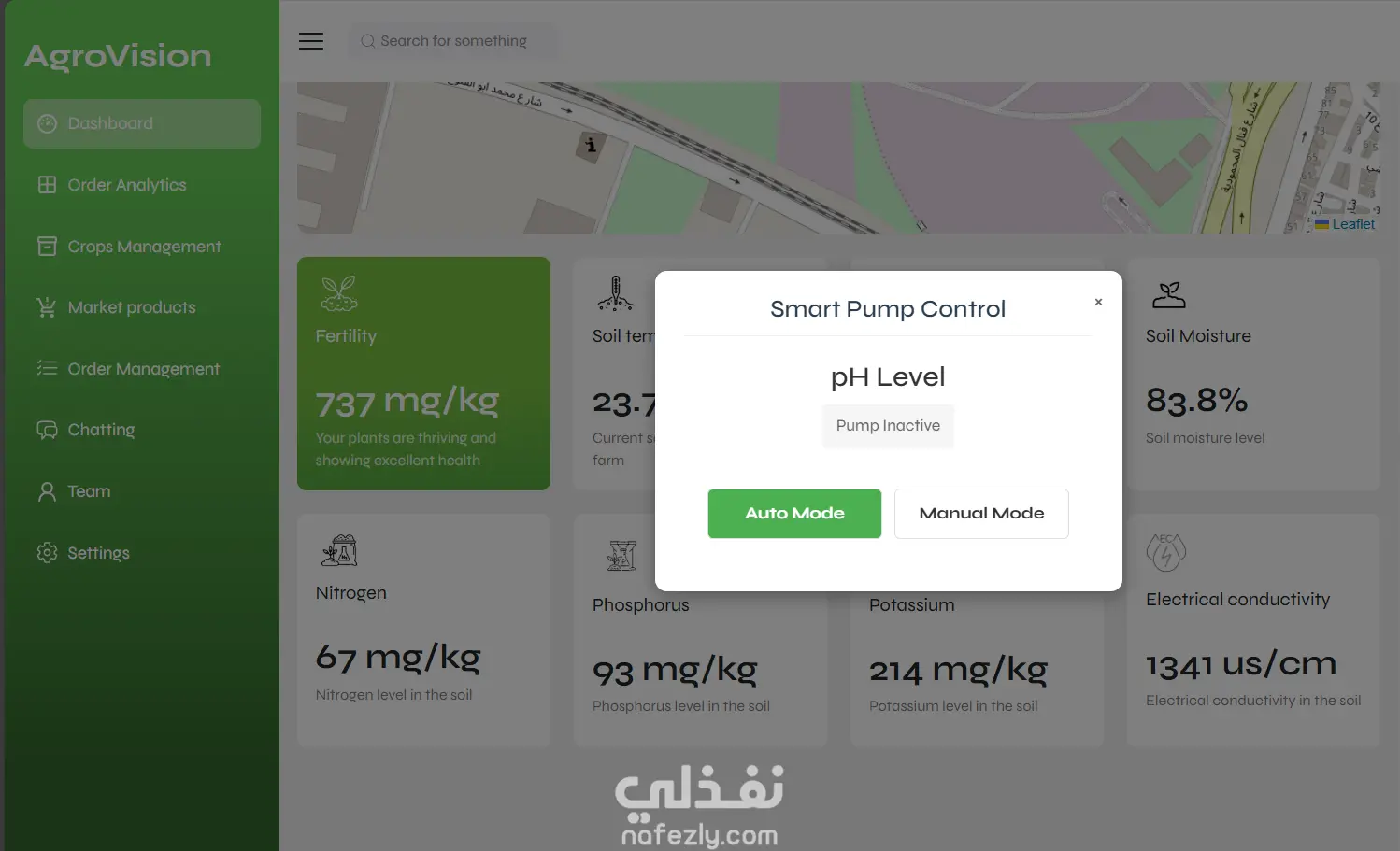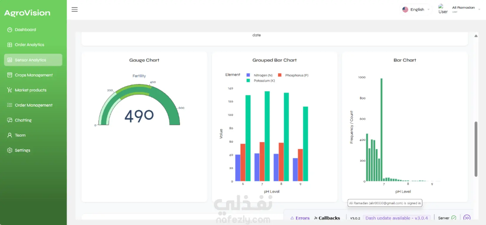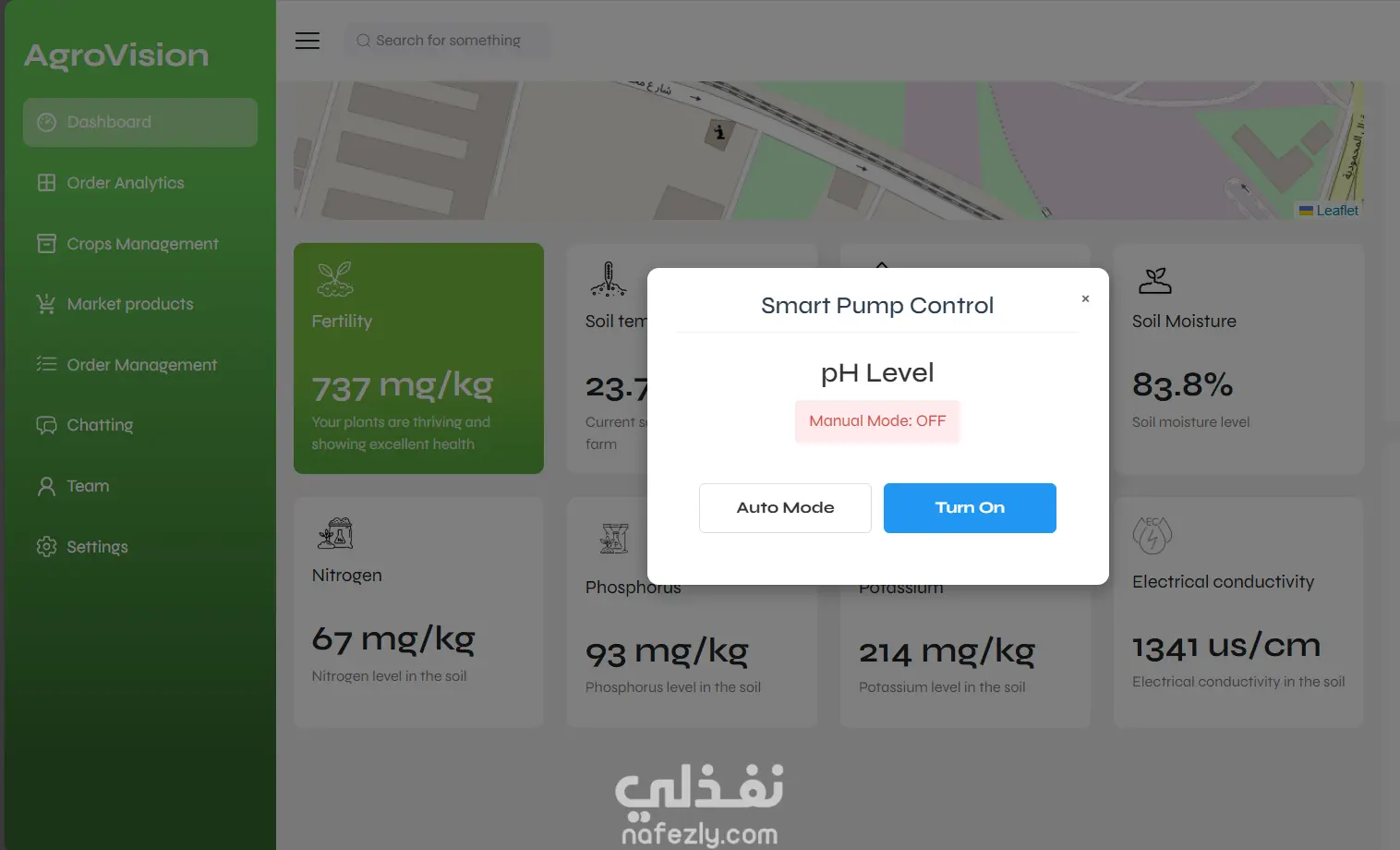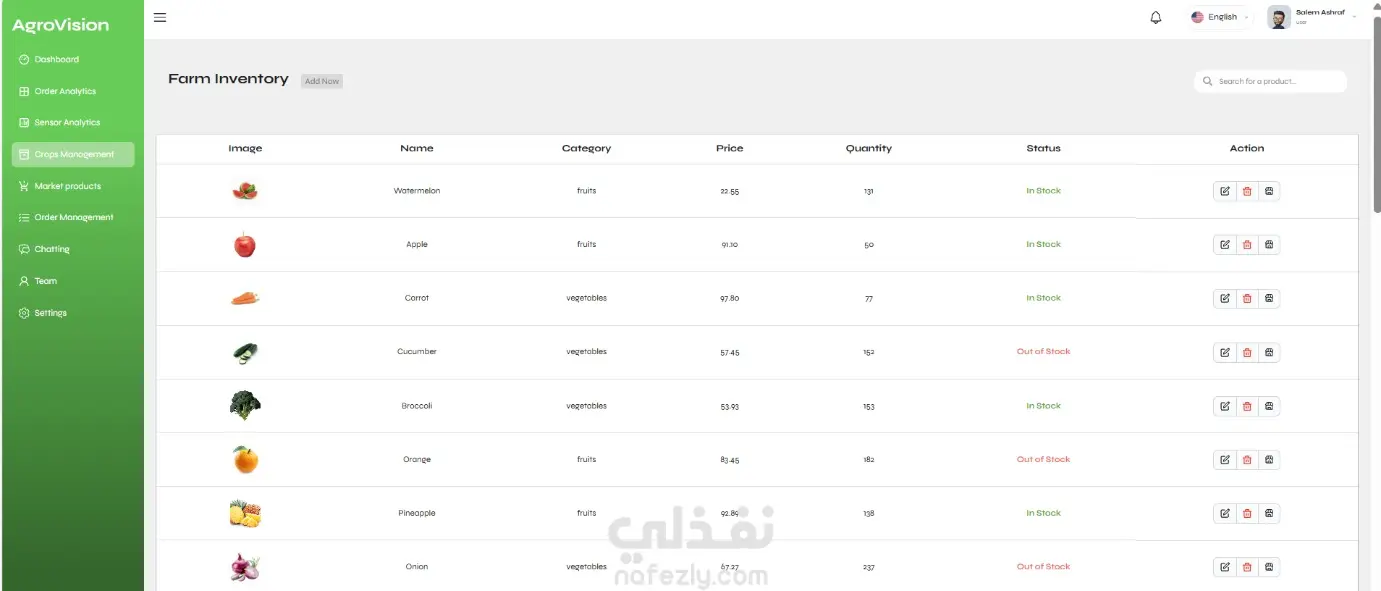 النظام عبارة عن داشبورد ويب ذكي يربط بين أجهزة الاستشعار (IoT) والذكاء الاصطناعي (AI) لإدارة المزرعة بشكل متكامل، ويتميز بالآتي: قراءات لحظية للسينسورات: متابعة حالة المزرعة مباشرة من خلال البيانات التي تجمعها أجهزة الاستشعار. التحكم في مضخة المياه: إمكانية تشغيل وإيقاف المضخة عن بُعد من خلال الداشبورد. نظام Chatbot ذكي بالذكاء الاصطناعي: يجيب على استفسارات المستخدم أو المدير حول حالة الزراعة، ويحلل قراءات السينسورات لتقديم توصيات دقيقة. ربط مع منصة التجارة الإلكترونية (E-commerce): متابعة المخزون المتاح وتسعيره تلقائيًا. عرض الكميات المتوفرة في المخزون (Inventory). إشعارات تنبيهية: إرسال إشعارات فورية عند توقف أي سينسور أو حدوث مشكلة. نظام محادثات مع العملاء: تسهيل التواصل مع العملاء المهتمين بالمنتجات والإجابة على استفساراتهم مباشرة. الباك-إند وإدارة المستخدمين: تم تطوير باك-إند متكامل يتيح التحقق من المستخدمين باستخدام OTP لضمان أمان الحسابات وتأكيد الهوية. النظام يقدم حل متكامل يجمع بين مراقبة المزرعة، التحكم في الأجهزة، دعم القرارات بالذكاء الاصطناعي، إدارة التجارة الإلكترونية، وأمان المستخدمين في واجهة واحدة سهلة الاستخدام.