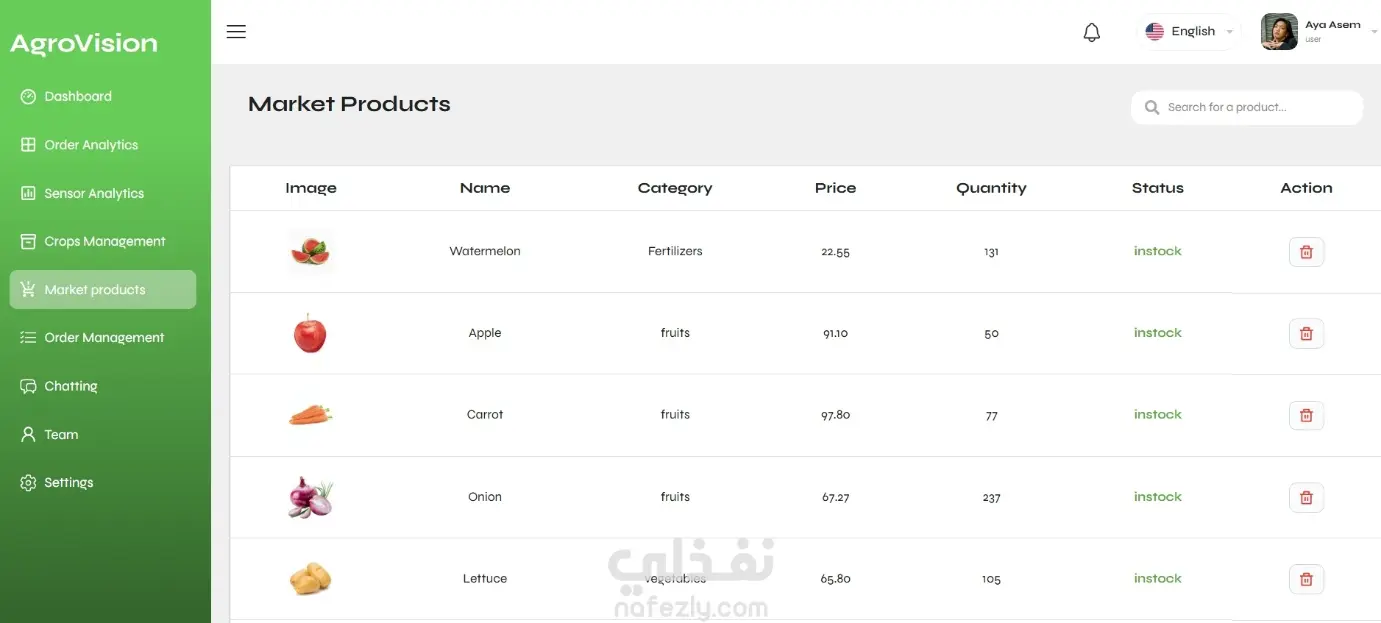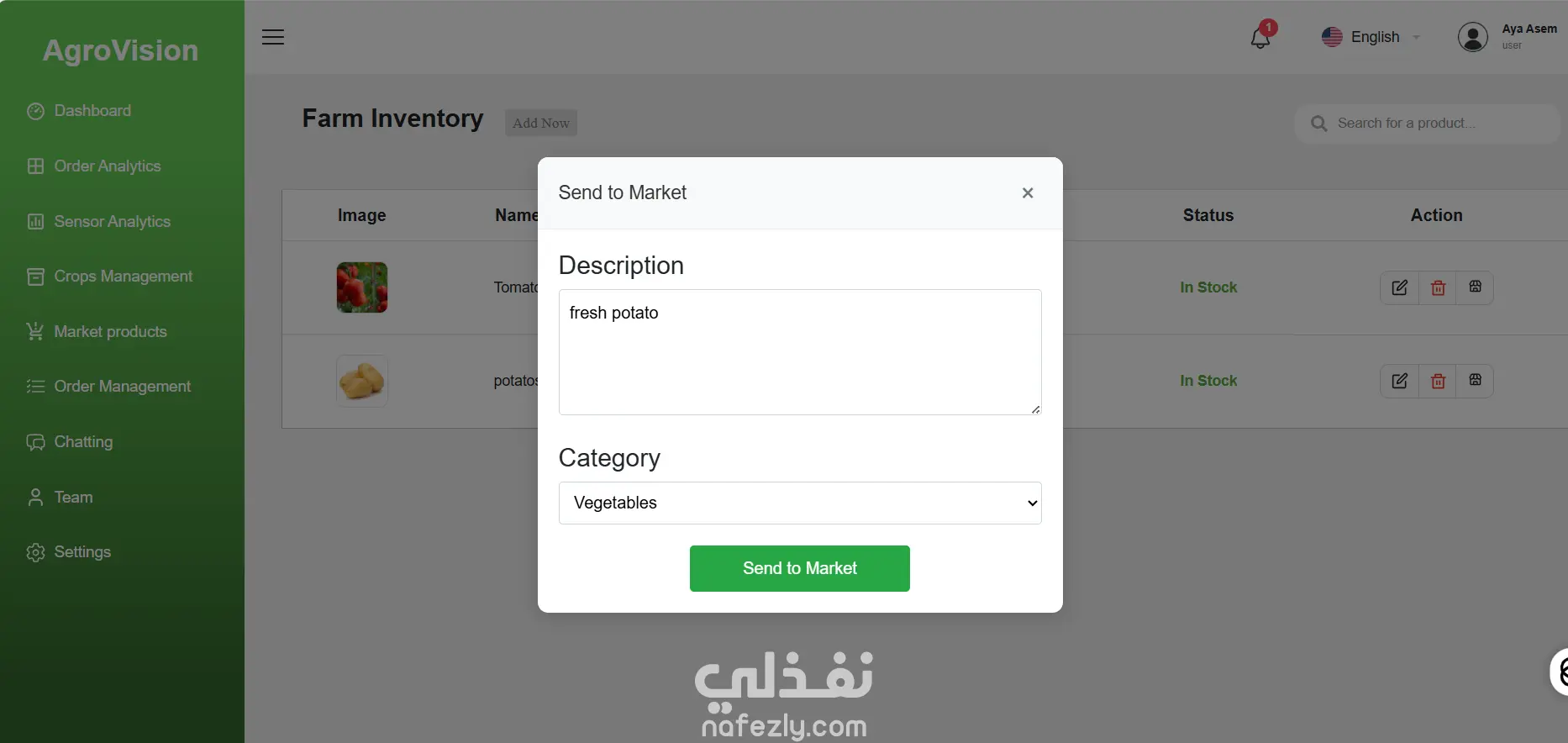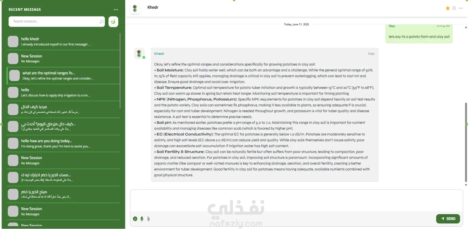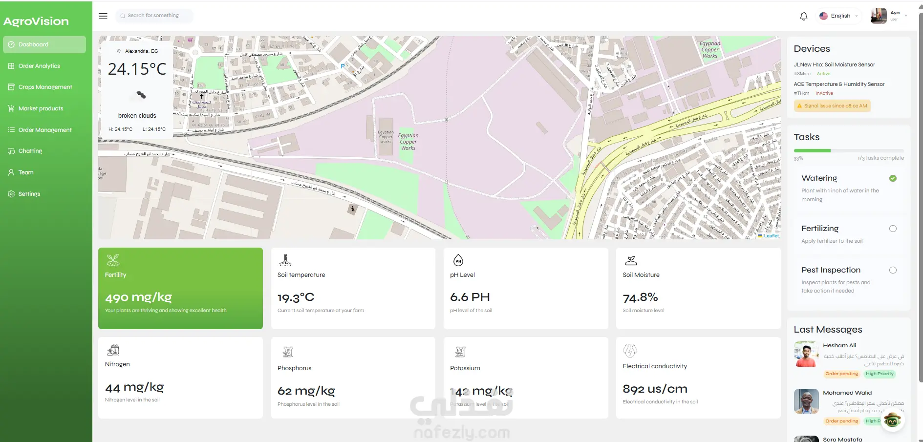 النظام عبارة عن داشبورد ويب ذكي يربط بين أجهزة الاستشعار (IoT) والذكاء الاصطناعي (AI) لإدارة المزرعة بشكل متكامل، ويتميز بالآتي: قراءات لحظية للسينسورات: متابعة حالة المزرعة مباشرة من خلال البيانات التي تجمعها أجهزة الاستشعار. التحكم في مضخة المياه: إمكانية تشغيل وإيقاف المضخة عن بُعد من خلال الداشبورد. نظام Chatbot ذكي بالذكاء الاصطناعي: يجيب على استفسارات المستخدم أو المدير حول حالة الزراعة، ويحلل قراءات السينسورات لتقديم توصيات دقيقة. ربط مع منصة التجارة الإلكترونية (E-commerce): متابعة المخزون المتاح وتسعيره تلقائيًا. عرض الكميات المتوفرة في المخزون (Inventory). إشعارات تنبيهية: إرسال إشعارات فورية عند توقف أي سينسور أو حدوث مشكلة. نظام محادثات مع العملاء: تسهيل التواصل مع العملاء المهتمين بالمنتجات والإجابة على استفساراتهم مباشرة. الباك-إند وإدارة المستخدمين: تم تطوير باك-إند متكامل يتيح التحقق من المستخدمين باستخدام OTP لضمان أمان الحسابات وتأكيد الهوية. النظام يقدم حل متكامل يجمع بين مراقبة المزرعة، التحكم في الأجهزة، دعم القرارات بالذكاء الاصطناعي، إدارة التجارة الإلكترونية، وأمان المستخدمين في واجهة واحدة سهلة الاستخدام.