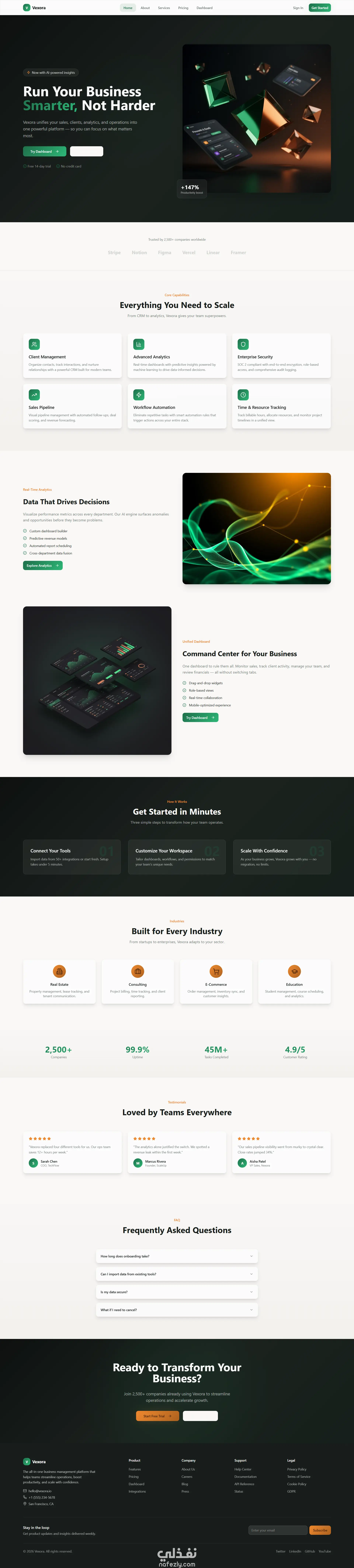 قمت بتصميم وتطوير موقع ويب احترافي متكامل (SaaS Platform) مخصص لإدارة الأعمال، يجمع بين واجهة مستخدم حديثة (UI) وتجربة مستخدم سلسة (UX)، بالإضافة إلى لوحة تحكم (Dashboard) تفاعلية تساعد في متابعة البيانات واتخاذ القرارات.