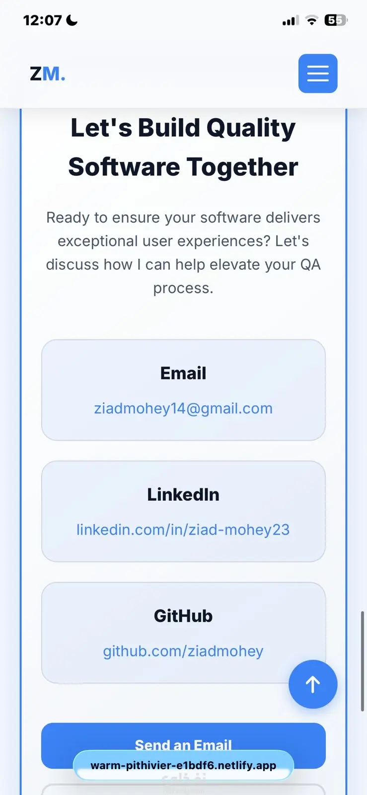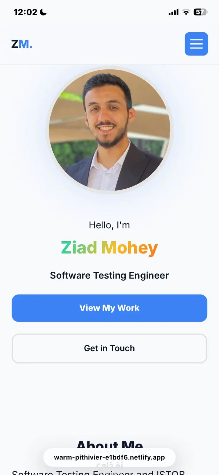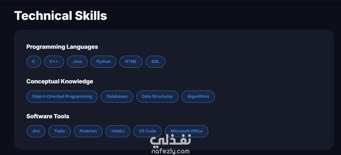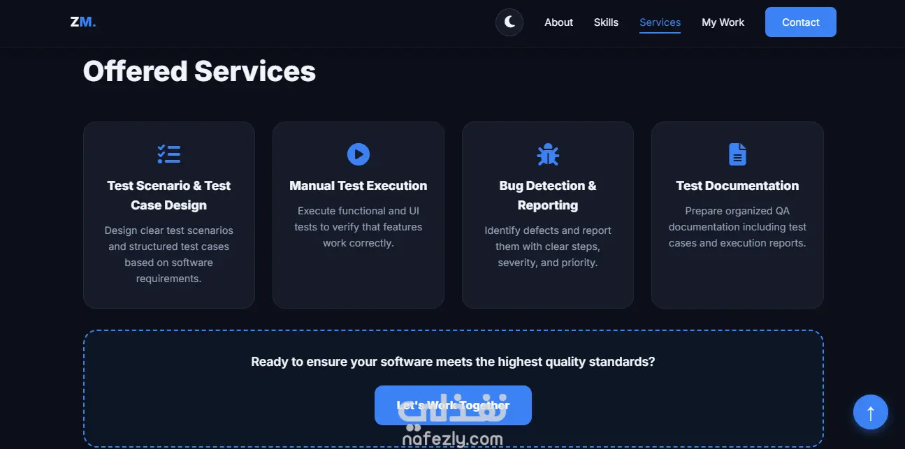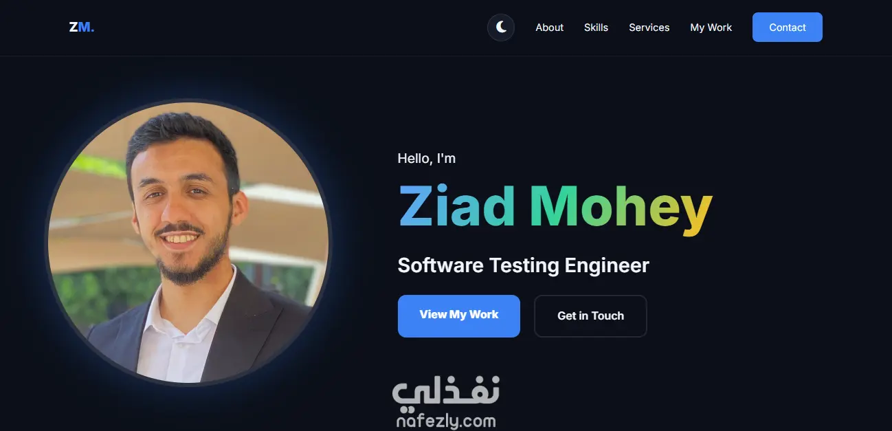 موقع بورتفوليو شخصي لعرض المشاريع والخبرات بطريقة منظمة وجذابة. الموقع متجاوب مع كل الأجهزة (Desktop, Tablet, Mobile) ويحتوي على: Home / الرئيسية: اسمك، جملة تعريفية، وصورة شخصية About / عني: نبذة عنك، المهارات، والشهادات Skills / المهارات: المهارات التقنية المتعلقة بتخصصك Previous Work / المشاريع: عرض المشاريع مع وصف قصير، المهارات المستخدمة، ورابط معاينة لكل مشروع Services / الخدمات: عرض الخدمات التي تقدمها للعملاء Contact / تواصل: نموذج اتصال أو بيانات التواصل