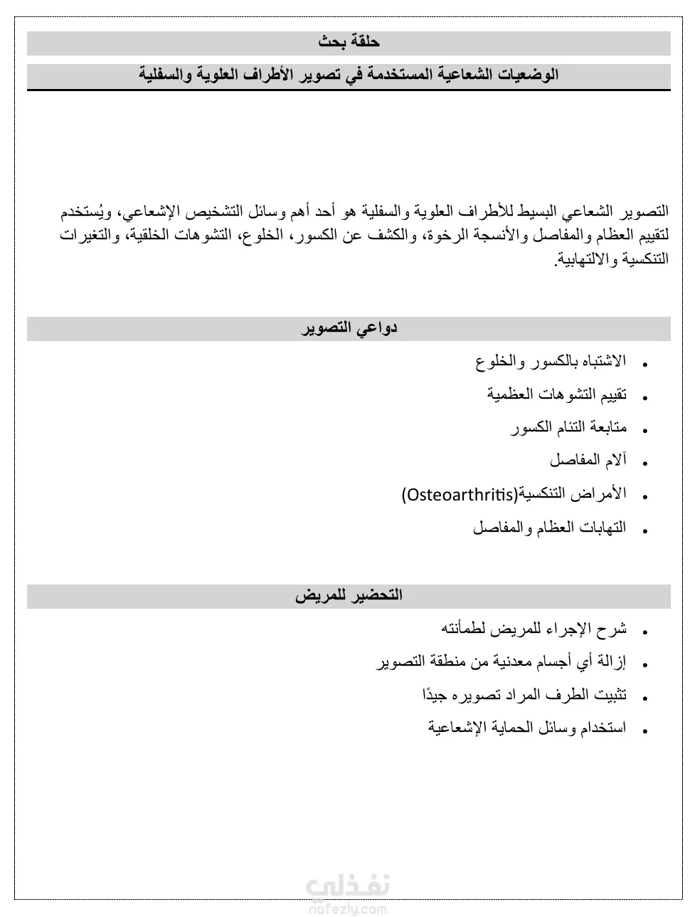 بحث طبي منظم يشرح الوضعيات الشعاعية في تصوير الأطراف العلوية والسفلية مع التركيز على التطبيق العملي. يتناول أهم تقنيات التصوير للأجزاء المختلفة مثل اليد، الرسغ، الساعد، القدم، الكاحل والركبة، مع شرح خطوات الإجراء والدلالات التشخيصية لكل وضعية. كما يسلّط الضوء على الأخطاء الشائعة وطرق الوقاية الإشعاعية، مما يجعله مرجعًا عمليًا مهمًا لطلاب الطب وفنيي الأشعة لتحسين جودة التشخيص.