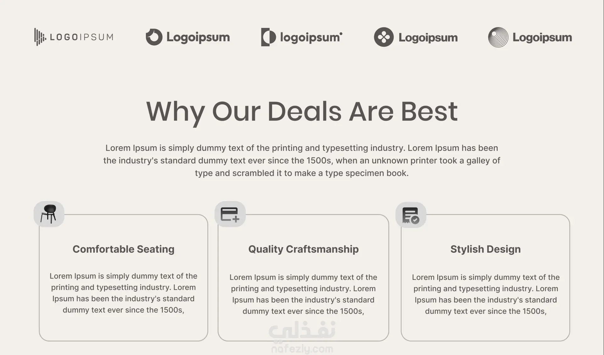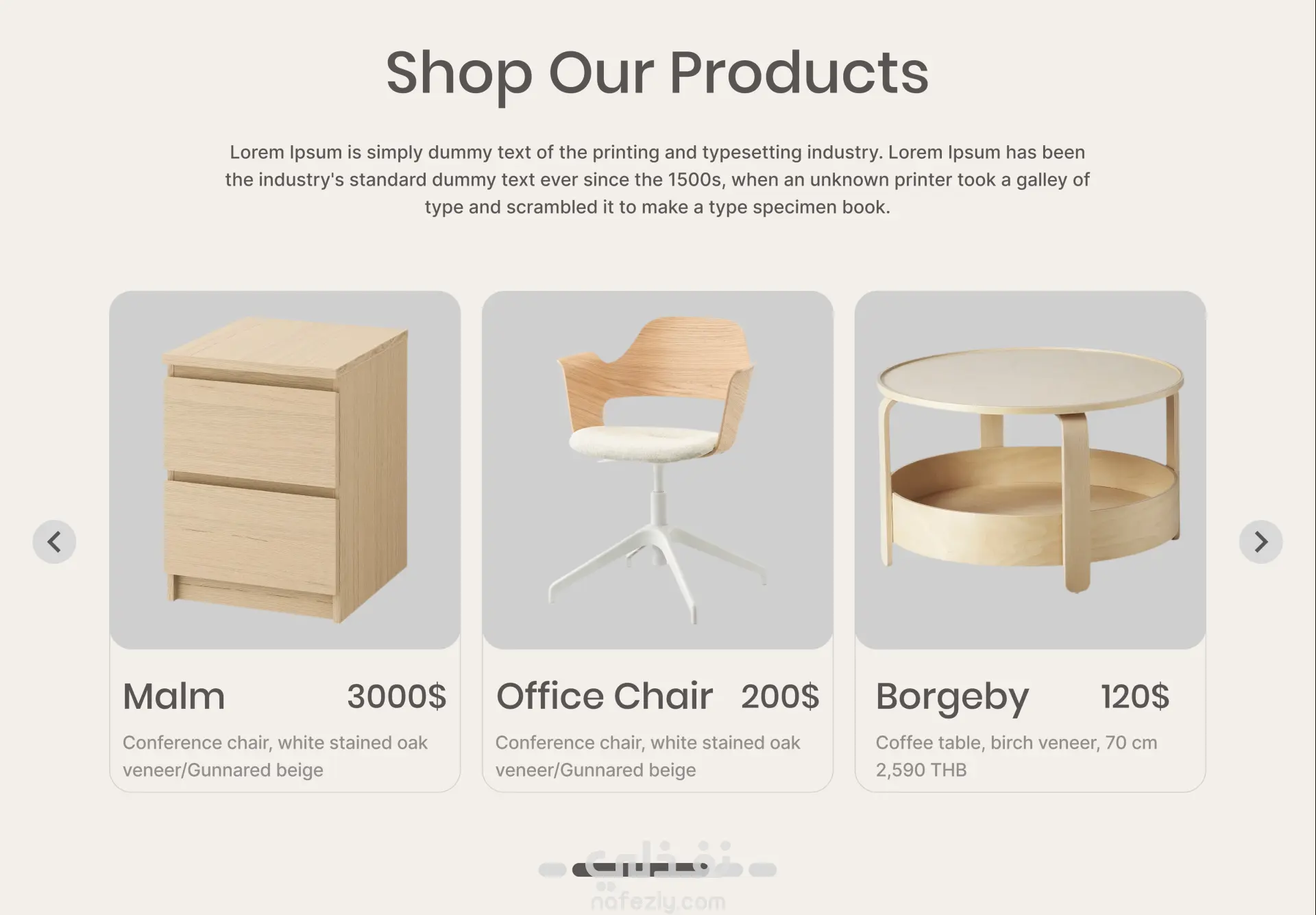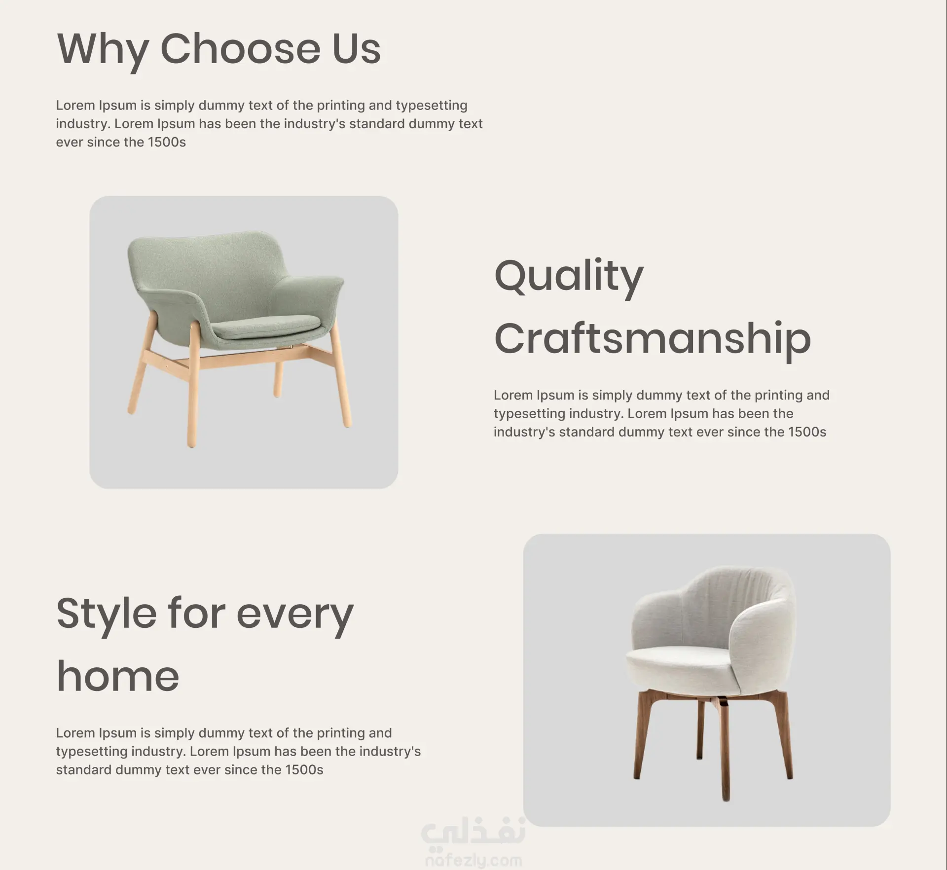 تصميم صفحة هبوط (Landing Page) احترافية لمواقع الأثاث، بستايل عصري وأنيق يركز على إبراز المنتجات بشكل واضح ومريح بصريًا، مع الحفاظ على تنظيم المحتوى وسهولة التصفح.