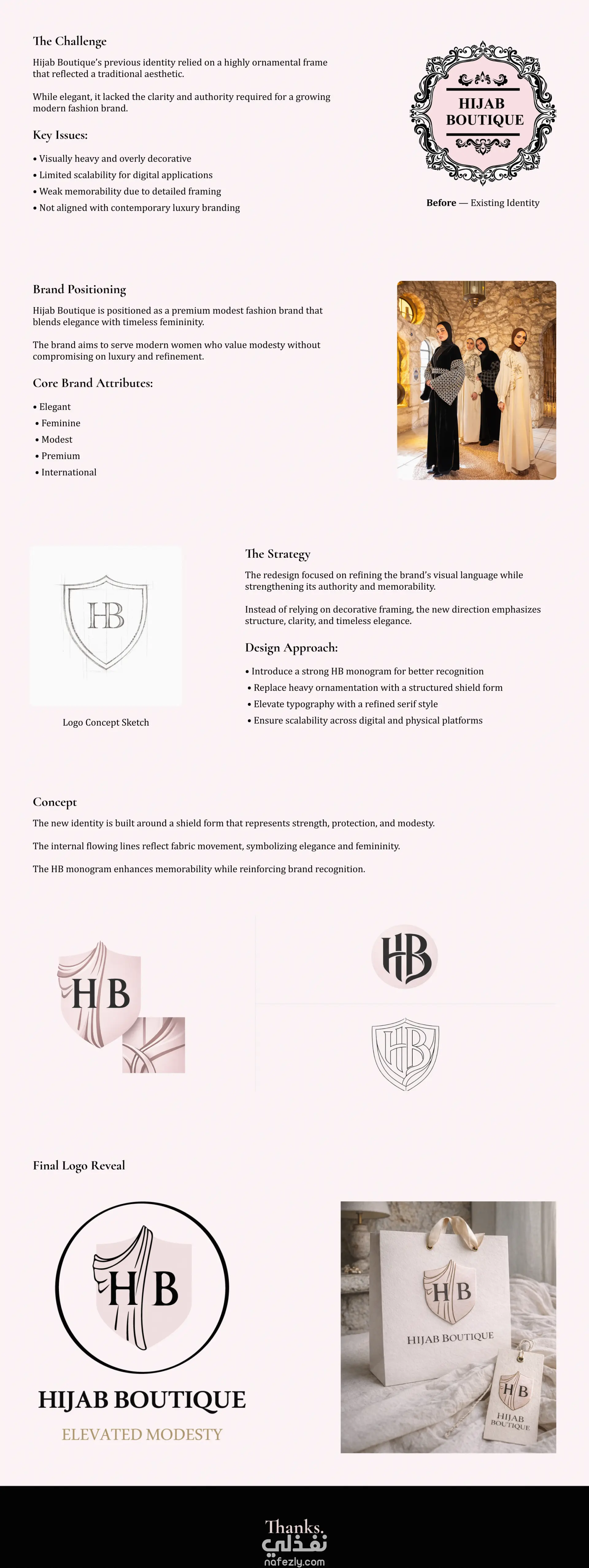 لقد قمت بإعادة تصميم شعار العلامة التجارية "Hijab Boutique" بطريقة احترافية تجمع بين الأناقة والبساطة لتعكس هوية العلامة وروحها المميزة وتترك انطباعًا جذابًا لدى العملاء. شمل العمل دراسة هوية العلامة التجارية لضمان توافق التصميم مع رسالتها، إعداد عدة مقترحات للشعار واختيار أفضل تصميم.