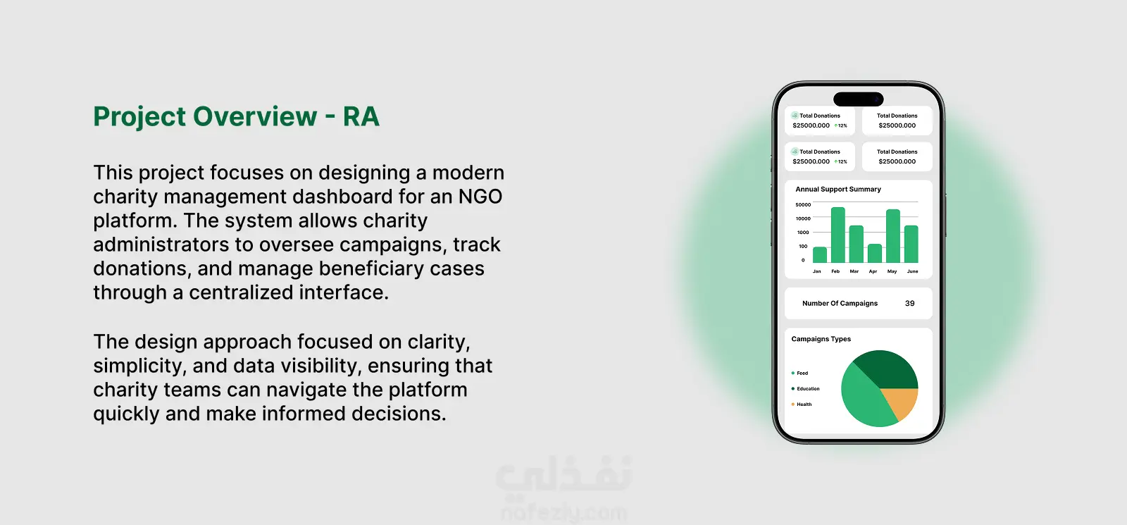 مشروع RAA هو تصميم واجهة وتجربة مستخدم لموقع إلكتروني يهدف إلى مساعدة الجمعيات الخيرية على تنظيم أعمالها وإدارة الأنشطة والمتطوعين بكفاءة. ركز التصميم على تقديم تجربة مستخدم واضحة وسهلة تساعد المسؤولين على إدارة العمليات اليومية بسلاسة، مع واجهة منظمة تدعم سرعة الوصول للمعلومات.