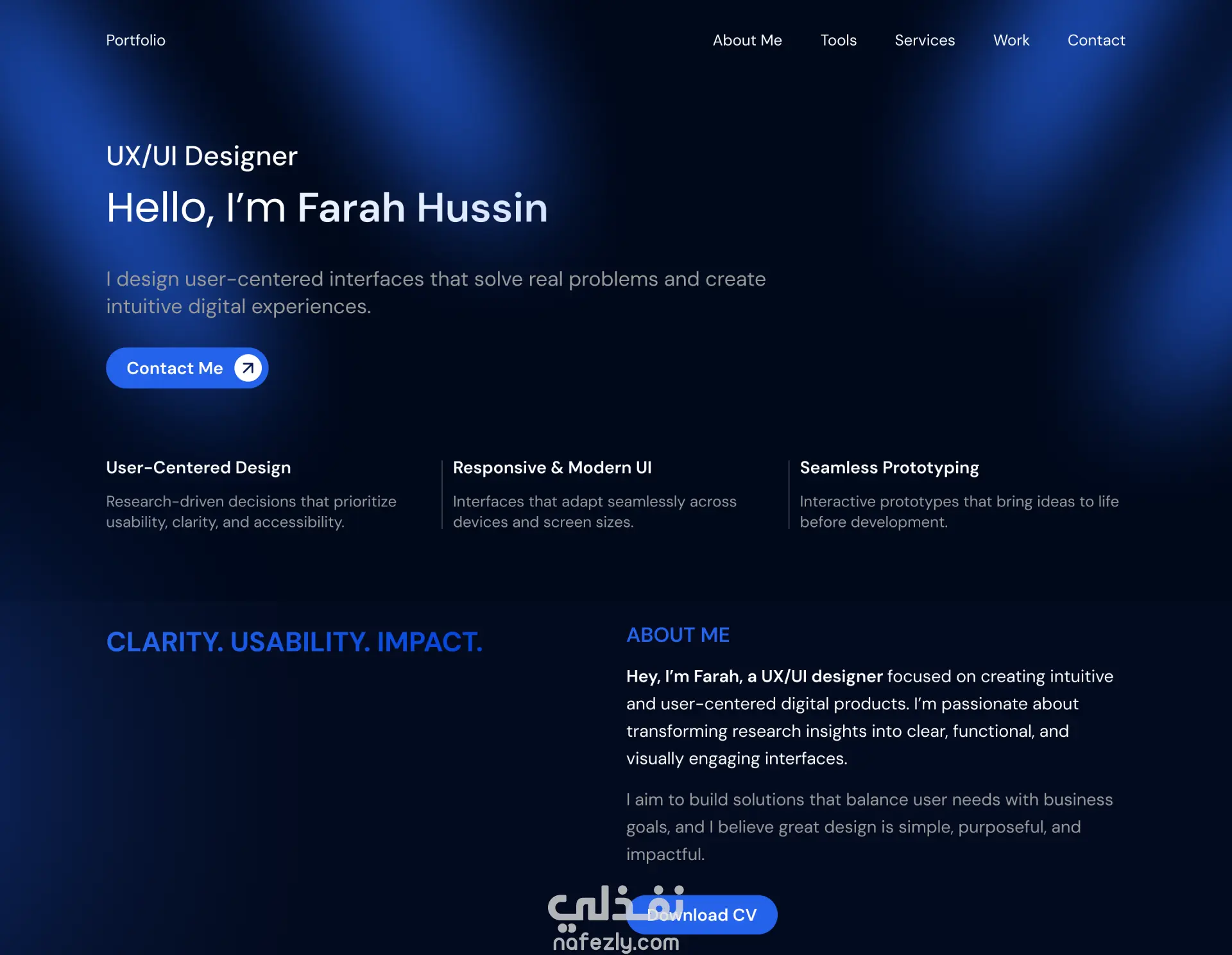 - تخطيط واضح يشمل: Hero، About، Tools، Services، Work، Contact