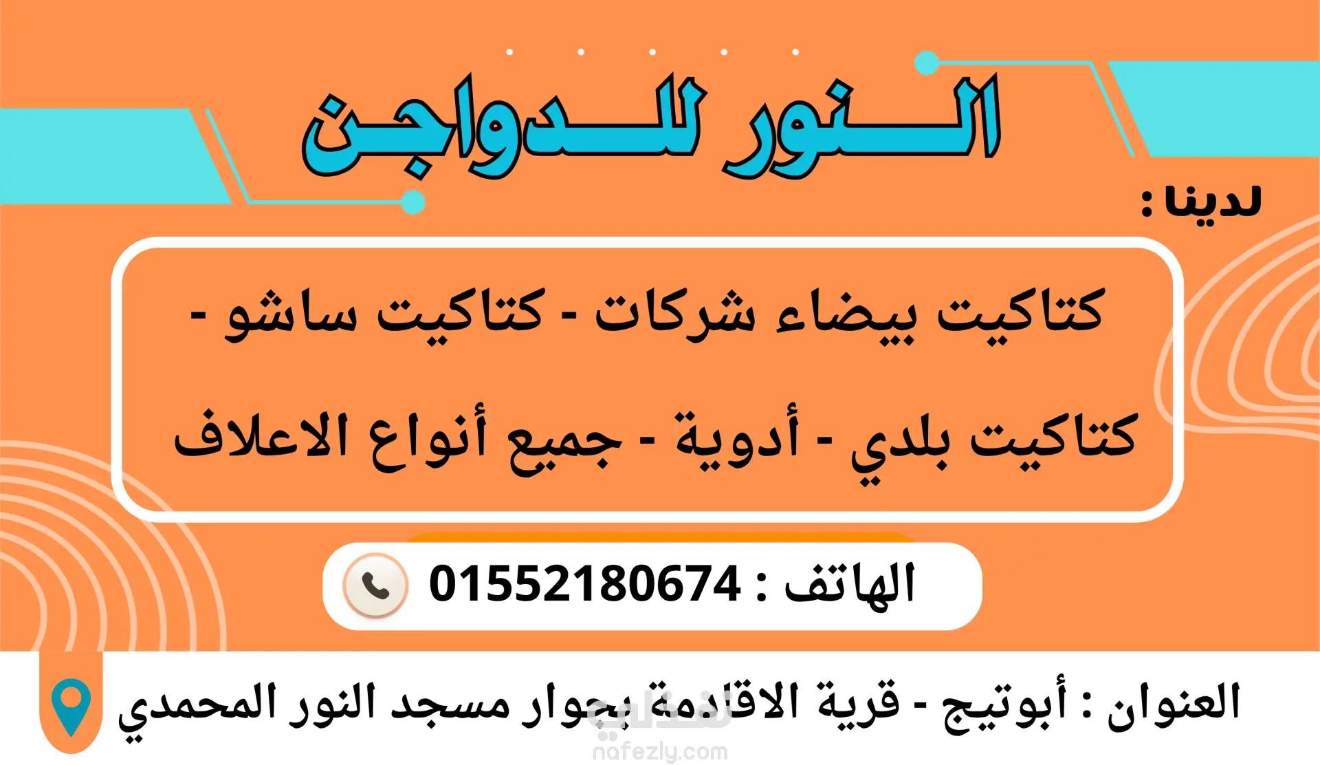 كارت عمل احترافي يتميز بأسلوب عصري وألوان جذابة تعكس هوية بصرية قوية وواضحة. يعتمد التصميم على لون برتقالي دافئ كلون أساسي يمنح إحساسًا بالحيوية والطاقة، مع لمسات من اللون التركوازي التي تضيف تباينًا جذابًا وتلفت الانتباه. تم تنسيق العناصر بشكل منظم داخل إطار أبيض ناعم بزوايا دائرية، مما يمنح التصميم مظهرًا أنيقًا وسهل القراءة. يبرز اسم العلامة "النور للدواجن" بخط عريض وواضح في أعلى الكارت، مما يعزز من قوة الهوية البصرية ويجعل الاسم سهل التذكر. أسفل العنوان، تم عرض الخدمات بشكل مرتب (كتاكيت بيضاء شركات، كتاكيت ساسو، كتاكيت بلدي، أدوية، وجميع أنواع الأعلاف) بطريقة مباشرة تساعد العميل على فهم النشاط بسرعة. في الجزء السفلي، تم تخصيص مساحة لبيانات التواصل مثل رقم الهاتف والعنوان، مع استخدام أيقونات بسيطة (مثل أيقونة الهاتف والموقع) لإضافة لمسة احترافية وتحسين تجربة القراءة. كما أن استخدام الخلفيات الهندسية الدائرية الخفيفة يضيف عمقًا بصريًا دون تشويش، بينما عرض الكارت بأسلوب موك أب مائل مع ظل خفيف يعطي إحساسًا واقعيًا واحترافيًا للتصميم.