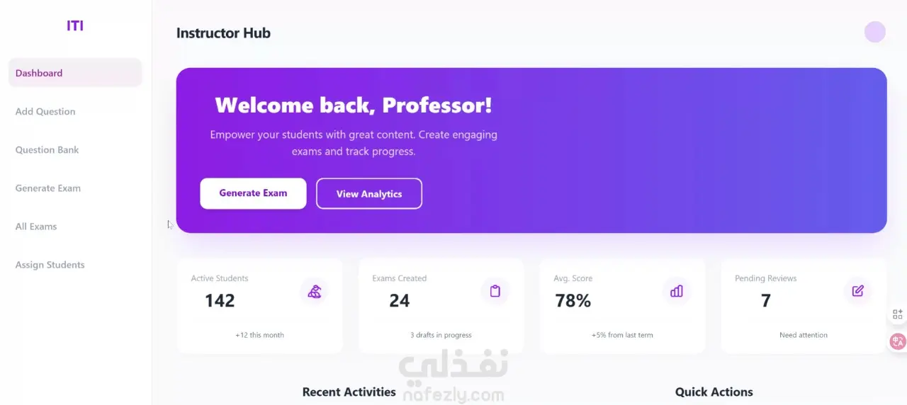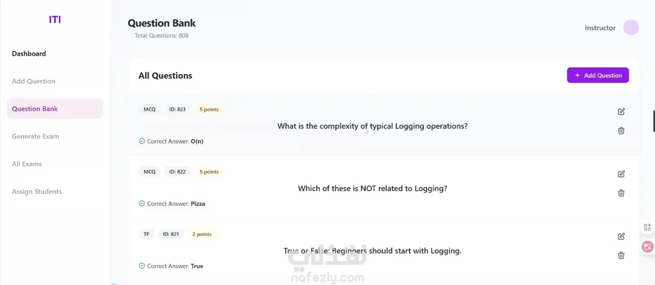 تتيح المنصة للمحاضر إضافة الأسئلة، تعديلها، وحذفها، مع إمكانية إنشاء امتحانات مخصصة وتحديد عدد الأسئلة داخل كل امتحان حسب متطلبات الكورس.