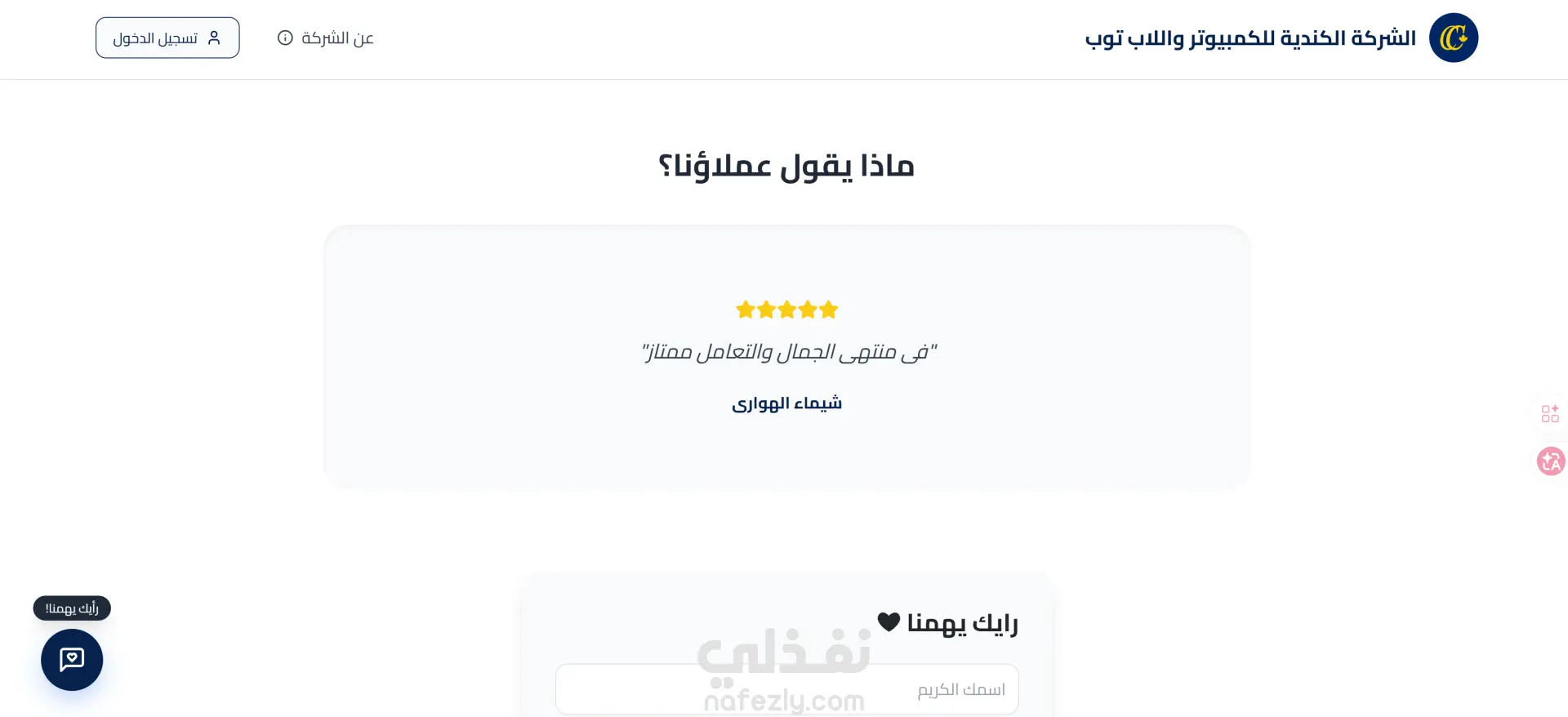 كما يحتوي على صفحة «رأيك يهمنا» لعرض آراء وتوصيات العملاء حول الشركة وجودة التعامل، ويتم إظهارها بشكل تفاعلي داخل Slider.