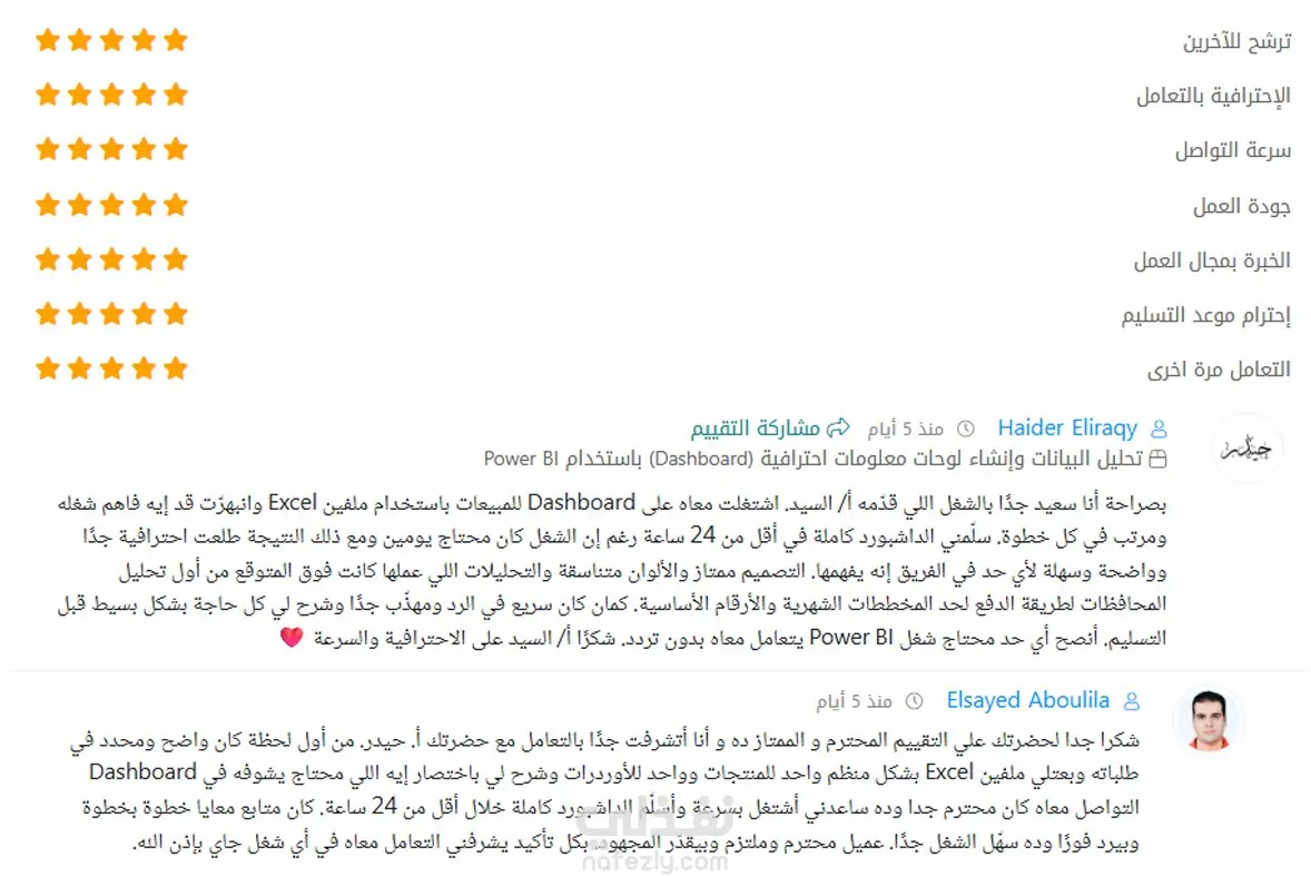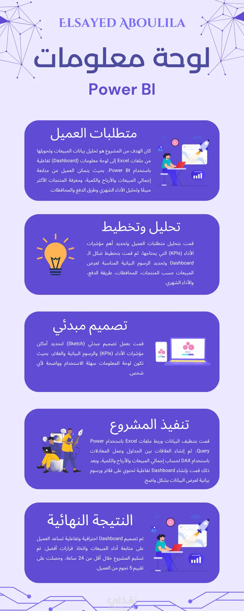 قمت بالعمل على مشروع تحليل بيانات مبيعات لأحد العملاء، حيث كان الهدف هو تحويل بيانات المبيعات من ملفات Excel إلى Dashboard تفاعلية باستخدام Power BI لمساعدة العميل على متابعة أداء المبيعات واتخاذ قرارات أفضل. قمت بتنظيف البيانات باستخدام Power Query وربط أكثر من ملف Excel معًا، ثم قمت بإنشاء العلاقات بين الجداول وبناء مؤشرات الأداء (KPIs) باستخدام DAX مثل: 1- إجمالي المبيعات 2- إجمالي الأرباح 3- إجمالي الكمية كما قمت بإنشاء رسوم بيانية لعرض: 1- المنتجات الأكثر مبيعًا 2- المبيعات حسب المدينة 3- المبيعات حسب طريقة الدفع 4- تحليل الأداء الشهري مهارات متعلقة بالعمل: 1- Power BI 2- Excel 3- Data Analysis 4- Data Visualization 5- Dashboard 6- Power Query 7- DAX 8- Business Intelligence تم تصميم Dashboard بشكل احترافي وبسيط ليسهل على العميل استخدامه، وقد تم تسليم المشروع خلال أقل من 24 ساعة وحصلت على تقييم 5 نجوم من العميل.