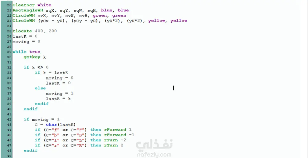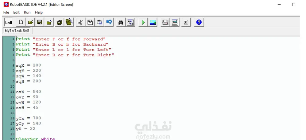 هذا المشروع عبارة عن محاكاة بسيطة لحركة روبوت باستخدام لغة RobotBASIC. الروبوت ممثل على شكل ساعة تتحرك داخل بيئة تحتوي على أشكال هندسية. يعتمد النظام على مفهوم Toggle Control باستخدام لوحة المفاتيح: عند ضغط المستخدم على F أو f تتحرك الساعة (الروبوت) إلى اليمين. عند ضغط المستخدم على B أو b تتحرك الساعة إلى اليسار. إذا ضغط المستخدم على نفس الزر السابق مرة أخرى يتوقف الروبوت عن الحركة (Waiting). الفكرة تحاكي سلوك الأزرار في الأنظمة الروبوتية حيث يعمل الزر كـ تشغيل/إيقاف للحركة بدلاً من الحركة اللحظية. مميزات المشروع استخدام الرسوميات في RobotBASIC. محاكاة حركة روبوت في بيئة ثنائية الأبعاد. التحكم في الحركة باستخدام لوحة المفاتيح. تطبيق مفهوم Toggle Button Contro