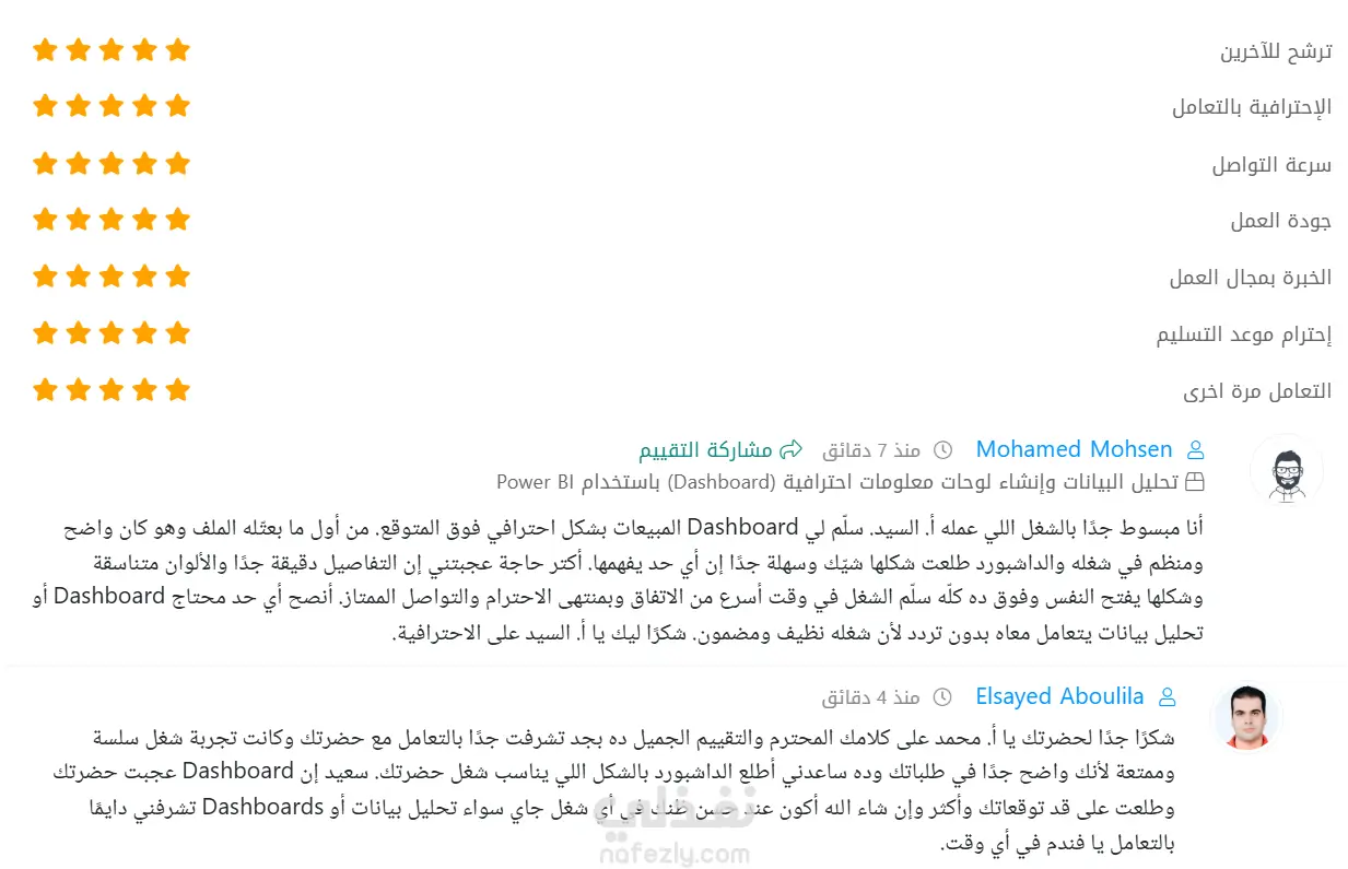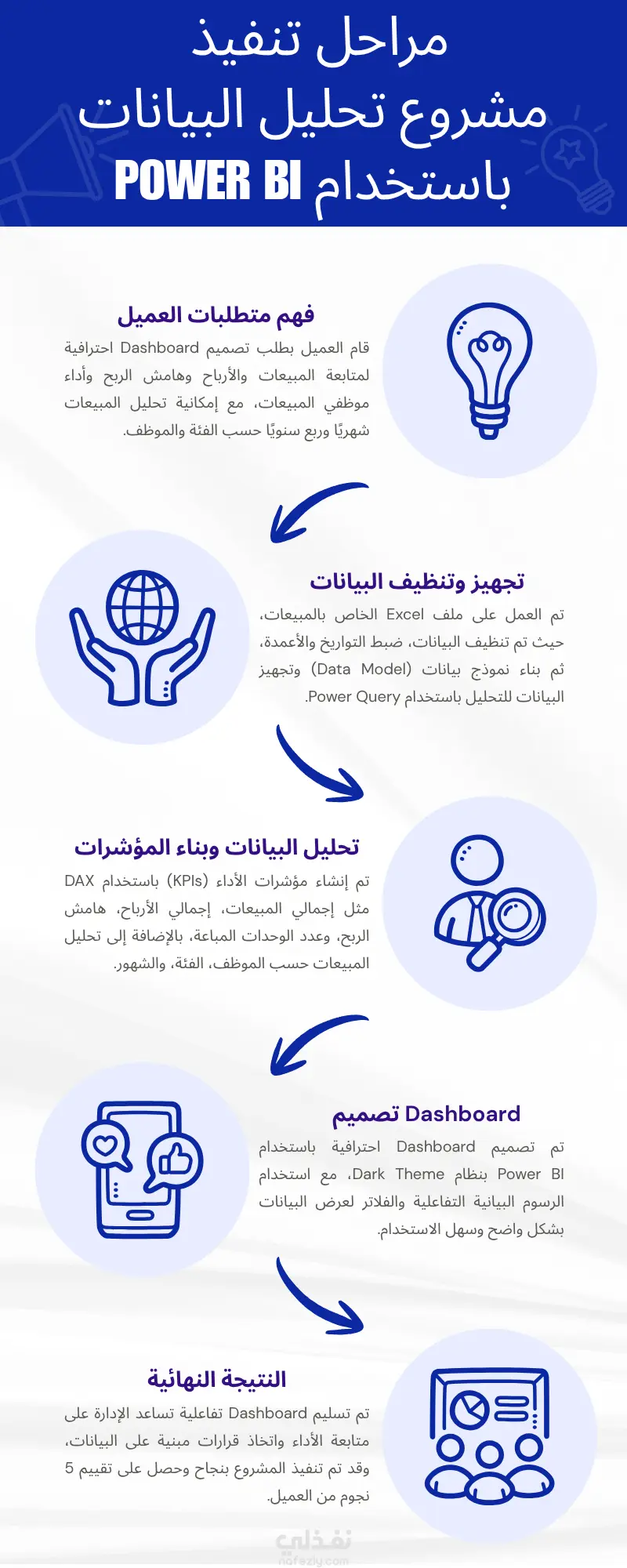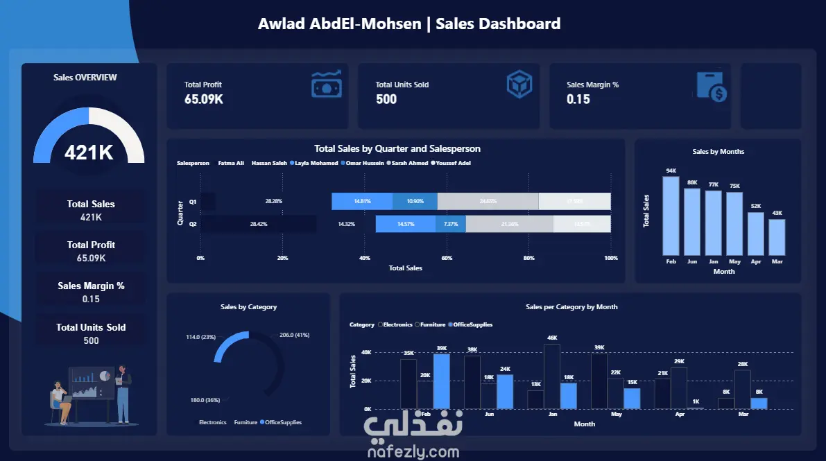 قمت بتنفيذ مشروع تحليل بيانات مبيعات لأحد العملاء باستخدام Power BI، حيث كان الهدف هو تصميم Dashboard احترافية تساعد في متابعة أداء المبيعات والأرباح بشكل واضح وسهل. بدأت العمل بتنظيف البيانات وتجهيزها باستخدام Power Query، ثم قمت ببناء نموذج البيانات وإنشاء المعادلات (Measures) باستخدام DAX لحساب: 1- إجمالي المبيعات 2- إجمالي الأرباح 3- هامش الربح 4- إجمالي الوحدات المباعة كما قمت بإنشاء مجموعة من التحليلات داخل Dashboard مثل: 1- تحليل المبيعات الربع سنوي حسب كل موظف مبيعات (Salesperson) 2- تحليل المبيعات الشهري 3- تحليل المبيعات حسب الفئة (Category) 4- تحليل المبيعات حسب الفئة لكل شهر 5- تصميم Dashboard باستخدام Dark Theme لتكون مريحة للقراءة وسهلة الاستخدام تم تسليم Dashboard بصيغة Power BI (PBIX) بعد الانتهاء من جميع التحليلات المطلوبة.