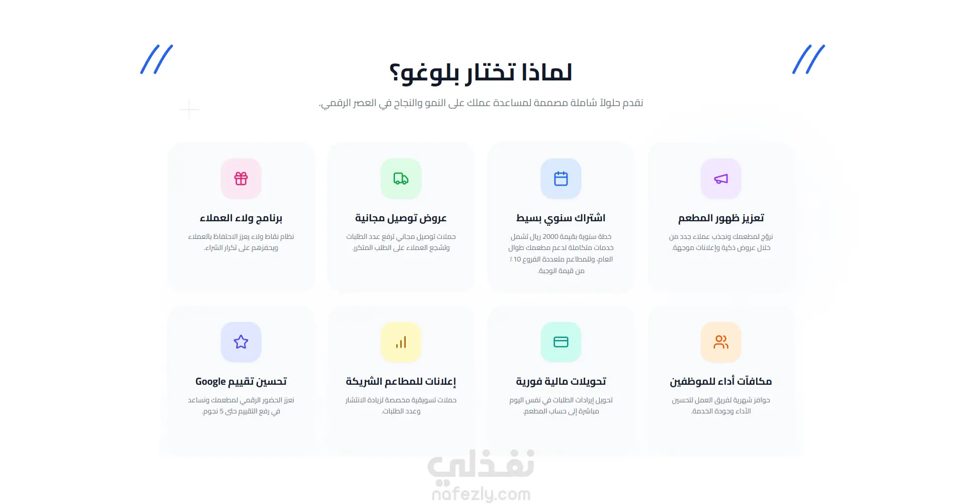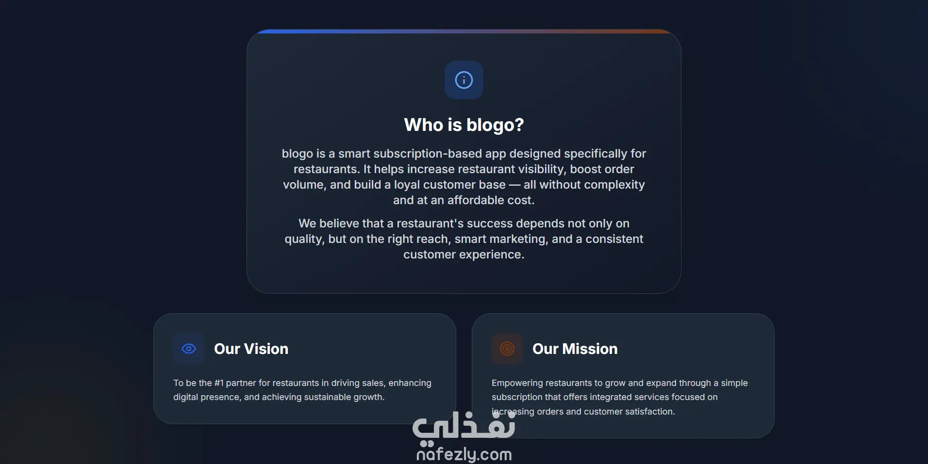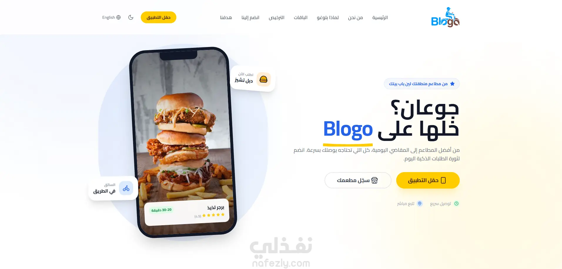 صفحة هبوط احترافية وتقديم لشركة Blogo (بلوغو)، وهي منصة اشتراكات ذكية تستهدف المطاعم لزيادة الظهور، رفع الطلبات، وبناء قاعدة عملاء وفية من خلال حملات توصيل مجاني وأنظمة ولاء متقدمة.